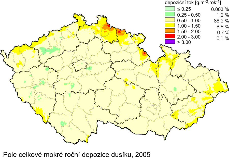 oblastech až na hodnotu 2–3 g.m-2.rok-1. Celková mokrá