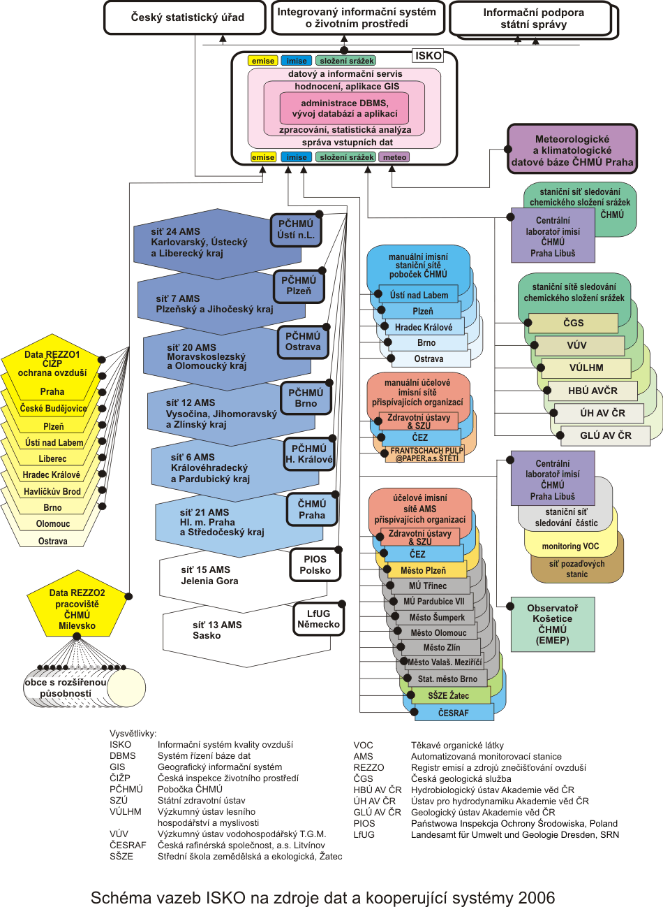 lokality Ostrava–Bartovice. Metodický rozvoj a technické zajištění každoročního celorepublikového zpracování a vedení archivu databází REZZO 1 a REZZO 2 provádí ČHMÚ. V rámci emisní části ISKO je od r. 1993 zajišťována archivace ročních vykazovaných emisních údajů a doprovodných technických údajů cca z 3600 zvláště velkých a velkých zdrojů. V rámci databáze REZZO 2 je prováděna archivace vykazovaných emisních a doprovodných technických údajů z více než 30 000 středních zdrojů, včetně datového servisu. Pro potřeby bilance malých zdrojů (domácí topeniště) byla v r. 1997 dokončena metodika zpracování údajů ze Sčítání lidu, domů a bytů (SLDB) provedeného v letech 1991 a 2001, jejímž výstupem jsou údaje o spotřebě základních druhů paliv spalovaných v domácnostech. Tyto údaje jsou každoročně aktualizovány ve spolupráci s regionálními dodavateli paliv a energií. Konečným výstupem databáze REZZO 3 jsou údaje o emisích znečišťujících látek a palivové skladbě domácích topenišť na úrovni jednotlivých obcí. Celková bilance malých zdrojů nezahrnuje údaje o emisích z drobných provozoven, zpoplatňovaných obecními a městskými úřady. Údaje o emisích znečišťujících látek ze zdrojů REZZO 4 zahrnují silniční, železniční, vodní a leteckou dopravu podle zpracování Centrem dopravního výzkumu (CDV) Brno. Na obr. -1 jsou schematicky znázorněny vazby ISKO na zdroje dat a kooperující systémy. Schéma vystihuje především propojení monitorovacích sítí kvality ovzduší, zdrojů vykazovaných dat se složkovou zpracovatelskou a informační vrstvou představovanou Informačním systémem kvality ovzduší a vazby na vyšší vrstvu – průřezové informační systémy. Faktické propojení je realizováno zejména výměnou dat elektronickou poštou, dále na magnetických médiích, po komutovaných linkách a v případě dat ze sítí automatizovaného imisního monitoringu (AIM) především s využitím radiového přenosu. Od roku 1993 jsou jak Tabelární přehled, tak Ročenka kompletně připravovány s rozsáhlým využitím nově koncipovaného výpočetního systému. Je jím počítačová síť s databázovým serverem s instalovaným mnohauživatelským relačním databázovým systémem. pod operačním systémem Unix. V roce 2003 byl realizován projekt nového datového modelu ISKO2 pod RSBMS Oracle. ISKO2 reaguje na narůstající požadavky na prezentaci údajů v různých formách, včetně publikování na internetu. Pojetí systému se opírá o koncepci distribuce zpracování v lokální síti na pracovních stanicích a osobních počítačích s přímým přístupem zpracovatelských a analytických programů, jako je geografický informační systém ARC/INFO a ArcView, statistické programy SPSS, Systat, tabulkové a grafické programy, k údajům v centrální databázi se zajištěným nepřetržitým a zálohovaným provozem. Český hydrometeorologický ústav má v každém bývalém krajském městě svoje pobočky, které především provádějí měření a zajišťují sběr údajů a jejich základní zpracování v rámci regionu. Pobočky jsou propojeny s centrálním systémem v Praze privátní datovou sítí ČHMÚ typu WAN využívající protokol TCP/IP. Obr. –1 Schéma vazeb ISKO na zdroje dat a kooperující systémy 2006