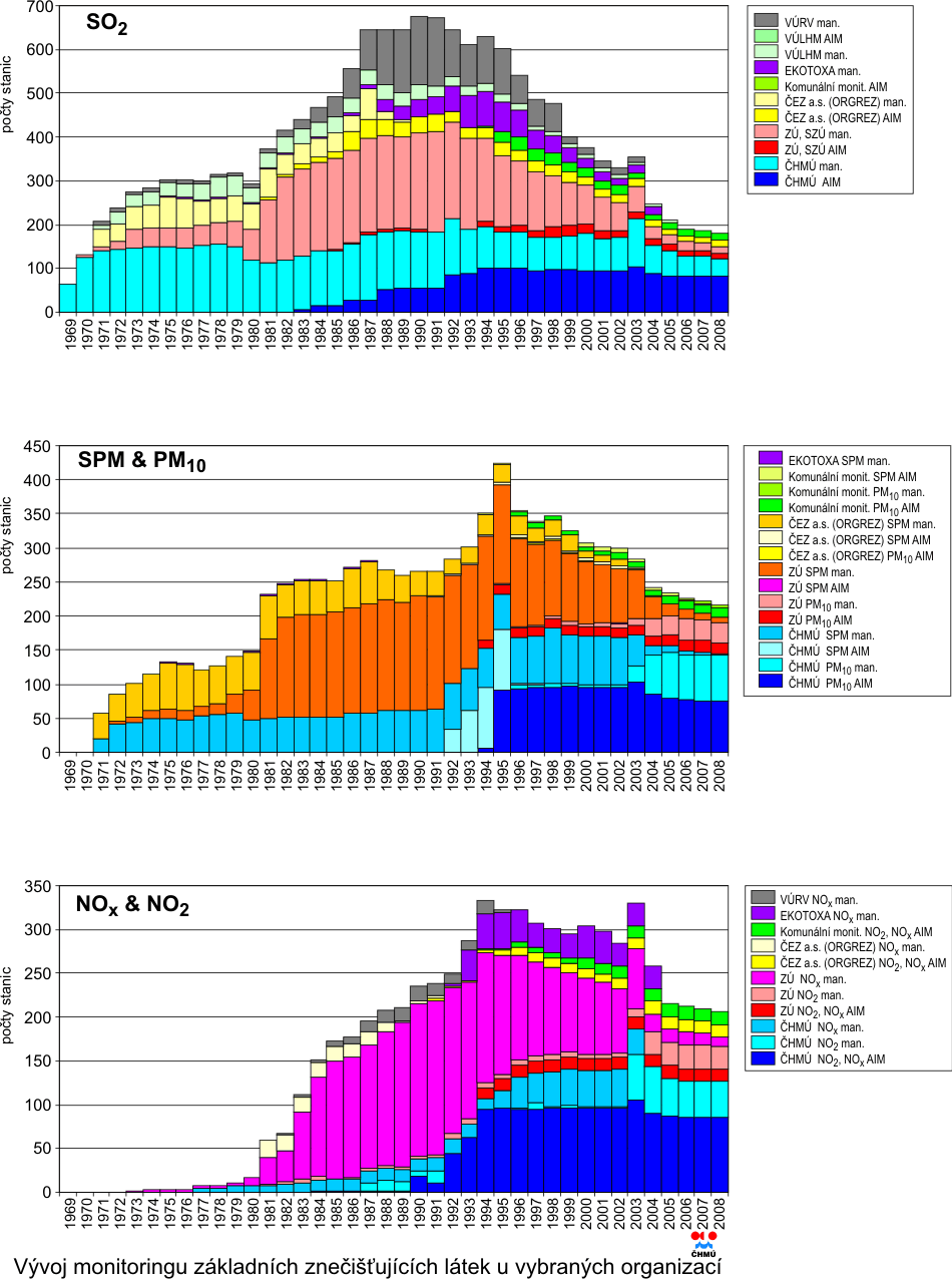 databáze Informačního systému kvality ovzduší (ISKO). Tab. II.1.2 uvádí přehled počtu lokalit podle vlastníka, kde se měří na automatizovaných monitorovacích stanicích (AMS) základní znečišťující látky. Na stanicích sítě AIM (automatizovaný imisní monitoring) jsou znečišťující látky měřeny kontinuálními analyzátory a naměřené koncentrace jsou jako 1hodinové průměry přenášeny v reálném čase prostřednictvím komutovaných linek nebo radiovým přenosem k dalšímu zpracování. Tab. II.1.3 uvádí pro jednotlivé kraje přehled počtu lokalit podle vlastníka, kde se měří na AMS další znečišťující látky, včetně doprovodných meteorologických veličin. Tab. II.1.4 uvádí přehled počtu lokalit v jednotlivých krajích, kde se uvedené znečišťující látky sledují manuálními postupy. Tab. II.1.5 pak uvádí celkové počty lokalit se speciálním měřením manuálními postupy podle vlastníka v jednotlivých krajích. Hustotu staničních sítí v jednotlivých oblastech České republiky a zastoupení monitorujících organizací vystihuje mapa na obr. II.1.1. Grafy na obr. II.1.2 znázorňují vývoj monitoringu základních znečišťujících látek od roku 1969 pro uvedené organizace a typy sítí, naměřená data jsou archivována v imisní databázi ISKO. Důležitým vodítkem při tvorbě map imisních charakteristik prezentovaných v