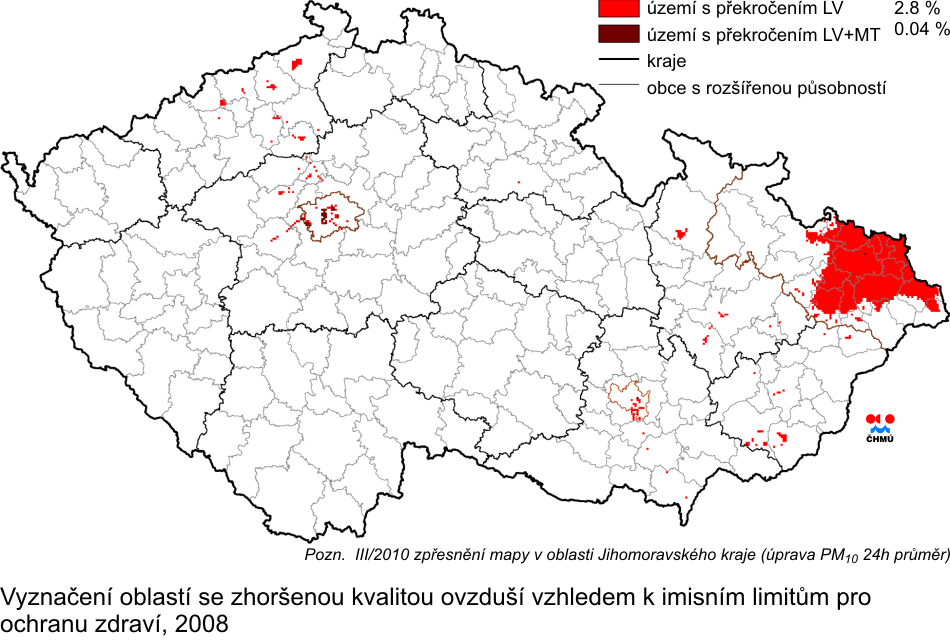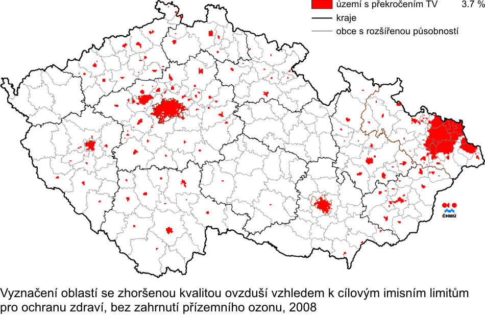 hlediska ochrany zdraví Výše popsanými postupy mapování byly připraveny mapy územního rozložení příslušných charakteristik kvality ovzduší, prezentované v předchozích částech, jak pro překročení imisních limitů, tak i pro překročení cílových imisních limitů. Oblasti s hodnotami imisních charakteristik většími než příslušné imisní (cílové) limity (červeně, případně hnědě vyznačené oblasti pro překročení limitu včetně meze tolerance) tak vymezují oblasti se zhoršenou kvalitou ovzduší. Tab. II.4.2.26 shrnuje seznam oblastí České republiky, kde byla podle výsledku mapování rozložení imisních charakteristik překročena v roce 2008 úroveň imisních limitů a zvlášť cílových imisních limitů pro ochranu zdraví lidí s uvedením procent překročení příslušného území. Tab. II.4.2.25. pak sumarizuje za rok 2008 oblasti překročení imisních limitů zvýšených o meze tolerance pro ochranu zdraví lidí. Tabulky ukazují procenta překročení příslušných imisních limitů, resp. cílových imisních limitů pro odpovídající území pro jednotlivé komponenty a imisní charakteristiky a v souhrnu jsou pak uvedeny oblasti, ve kterých je překročen alespoň jeden imisní limit, resp. cílový imisní limit některé z komponent. Procenta překročení uvedená v souhrnu v tab. II.4.2.26 odpovídají procentům území uvedeného administrativního celku, ve kterém je překročen aspoň jeden imisní limit z uvedeného souboru limitů pro ochranu zdraví lidí. Mapa na obr. II.4.2.57 znázorňuje vymezení oblastí se zhoršenou kvalitou ovzduší vzhledem k imisním limitům, mapa na obr. II.4.2.58 znázorňuje vymezení oblastí s překročením cílových imisních limitů pro ochranu zdraví lidí bez zahrnutí přízemního ozonu a na obr. II.4.2.59 se zahrnutím přízemního ozonu. Tabulka II.4.2.27 pak obsahuje seznam administrativních celků, kde byl překročen cílový imisní limit O3 pro ochranu zdraví v rámci oblastí České republiky a % plochy překročení daného územního celku. Troposférický ozon je uveden v samostatném přehledu, protože je zřejmé, že opatření pro snížení koncentrací překračujících cílový imisní limit, případně dlouhodobé imisní cíle pro ozon, má smysl přijímat na regionální a národní úrovni.