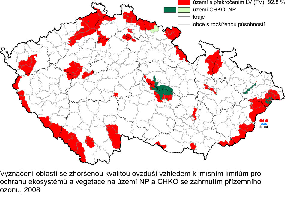 je klasifikována jako venkovská. Obr. II.4.2.57 Vyznačení oblastí se zhoršenou kvalitou ovzduší vzhledem k imisním limitům pro ochranu zdraví, 2008 Obr. II.4.2.58 Vyznačení oblastí se zhoršenou kvalitou ovzduší vzhledem k cílovým imisním limitům pro ochranu zdraví bez zahrnutí přízemního ozonu, 2008 Obr. II.4.2.59 Vyznačení oblastí se zhoršenou kvalitou ovzduší vzhledem k cílovým imisním limitům pro ochranu zdraví se zahrnutím přízemního ozonu, 2008 Obr. II.4.2.60 Vyznačení oblastí se zhoršenou kvalitou ovzduší vzhledem k imisním limitům pro ochranu ekosystémů a vegetace na území NP a CHKO bez zahrnutí přízemního ozonu, 2008 Obr. II.4.2.61 Vyznačení oblastí se zhoršenou kvalitou ovzduší vzhledem k imisním limitům pro ochranu ekosystémů a vegetace na území NP a CHKO se zahrnutím přízemního ozonu, 2008