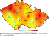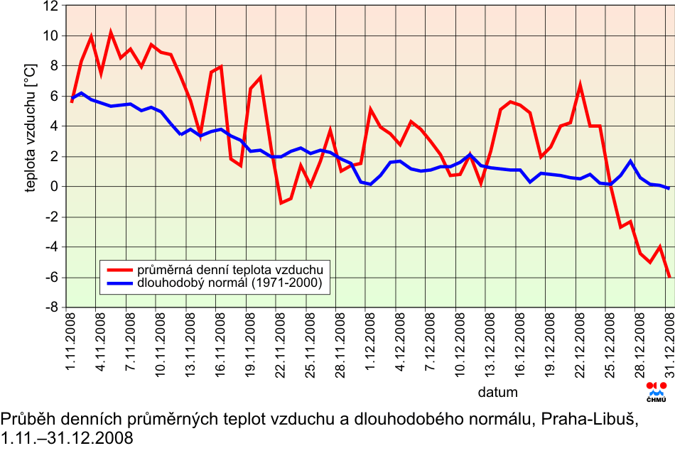 II.5 Hodnocení provozu smogových regulačních systémů na území České republiky v roce 2008 První dva a poslední dva zimní měsíce roku 2008 byly z hlediska teplot nadnormální, v lednu byla průměrná měsíční teplota 1,3 °C s odchylkou od normálu +4,1 °C a podobný byl i měsíc únor s průměrnou teplotou 2,3 °C a odchylkou +3,4 °C. Měsíc listopad 2008 s průměrnou měsíční teplotou 4,6 °C a prosinec 2008 s teplotou 0,7 °C se od normálu lišily o +1,9 respektive o +1,7 °C. Podle měření stanice Praha-Libuš byly měsíce leden a únor výrazně a listopad a prosinec 2008 mírně nadnormální. Celkově v 76,9 % délky sledovaného období se vyskytovaly kladné odchylky teploty vzduchu od dlouhodobého normálu. Ve sledovaném roce se vyskytla 3 výrazně teplejší období: 18.–21.1.2008 (maximální odchylka od normálu +10,9 °C), 27.–29.1.2008 (maximální odchylka od normálu +6,0 °C) a 21.–27.2.2008 (maximální odchylka od normálu +11,7 °C). Podobně se vyskytla 2 studená období: 22.–25.2.2008 (maximální odchylka od normálu -3,1 °C) a 26.–31.12.2008 (maximální odchylka od normálu –5,9 °C). Průměrné denní teploty vzduchu od 1.1. do 29.2.2008 a od 1.11. do 31.12.2008 a jejich dlouhodobý normál na stanici Praha-Libuš jsou uvedeny na obr. II.5.1 a II.5.2. Srážkově byly všechny 4 měsíce slabě až mírně podnormální. Největší množství srážek v porovnání s dlouhodobým normálem – 37 mm – spadlo v lednu 2008, což představuje 90 % hodnoty normálu. Pokud jde o absolutní hodnotu, nejvíce srážek 43 mm spadlo v listopadu 2008, což činí 87 % normálu. Nejméně srážek 27 mm spadlo v únoru 2008, což odpovídá 72 % dlouhodobého normálu. Anticyklonální situace se v období leden–únor a listopad–prosinec 2009 vyskytovaly v 28,1 % délky tohoto časového intervalu a jejich relativní četnost pro uvedené měsíce byla nerovnoměrná a pohybovala se mezi 16,1–38,7 %. Největší relativní četnost výskytu anticyklonálních situací 38,7 % byla v prosinci 2008 a nejnižší 16,1 % byla v lednu 2008. V únoru 2008 byla relativní četnost 31,0 % a v listopadu 26,7 %. Příčinou výrazně teplých období v lednu a únoru 2008 byl výskyt západní cyklonální situace typ Wc (11 dní) a severozápadní cyklonální situace typ NWc (2 dny), které jsou v zimním období charakteristické přílivem relativně teplého vzduchu ze středního Atlantiku. Příčinou výrazně studených období v listopadu a prosinci 2008 byl výskyt anticyklony ve střední Evropě typ A (3 dny), východní a severovýchodní anticyklonální situace typy Ea a NEa (3 dny), severní cyklonální typ Nc a putující brázdy nízkého tlaku typ Bp. Všechny uvedené situace jsou v zimním období charakteristické výraznými zápornými teplotními odchylkami. Průměrnou hodinovou koncentraci SO2, překračující zvláštní imisní limit 250 μg.m-3, registrovalo v průběhu celého roku 2008 celkem 13 stanic AIM, z toho 4 v Krušných horách, s výjimkou ledna a srpna. Překročení ve třech po sobě následujících hodinách byl zjištěno pouze na stanici Ostrava-Zábřeh s maximální hodnotou 959,7 μg.m-3. V Krušných horách se jednalo o kontakt kouřové vlečky s terénem, v ostatních případech byly vysoké koncentrace způsobeny místními zdroji znečištění ovzduší. K překračování limitní hodnoty 250 μg.m-3 pro NO2 došlo na stanici Legerova, celkově v 53 dnech, z toho v šesti případech ve třech následujících hodinách. Nejvyšší naměřená koncentrace byla 280,4 μg.m-3. Období s nejvyššími koncentracemi NO2 na stanici Legerova je znázorněno na obr. II.5.3. K jednohodinovým překročením došlo ještě na stanici: Praha 10-Průmyslová, v Ústí nad Orlicí, v Liberci a v Uherském Hradišti. Jak u koncentrací SO2, tak i pro NO2 docházelo k překračování stanoveného limitu pouze krátkodobě a koncentrace znečišťujících látek vždy rychle poklesly, takže podmínky pro vyhlášení signálů SVRS nebyly splněny. Podle vyhodnocení maximálních denních teplot na stanici Praha-Libuš bylo období od 1.4. do 30.9.2008 mírně nadnormální s odchylkou od normálu +1,3 °C, avšak výrazně teplotně rozkolísané. Teplotní odchylky od normálu se pohybovaly v intervalu od +10,7 °C do –13,0 °C. Nejvyšší průměrná měsíční teplotní odchylka ve sledovaném období byla v červnu s hodnotou +2,6 °C, nejnižší –0,2 °C byla v září, ve zbývajících měsících se pohybovala odchylka od + 0,5 °C do +1,1 °C. Ve sledovaném období se vyskytlo 14 dní s teplotou nad 30 °C a nejvyšší hodnota 32,2 °C byla naměřena dne 1.8.2008. Meteorologické podmínky pro vznik troposférického ozonu byly od 1.4. do 30.9.2008 jen málo příznivé, nejvhodnější byly v měsíci červenci, kdy se ve 2 dnech za sebou vyskytovaly koncentrace nad 180 μg.m-3 a dne 3.7.2008 byla na stanici Rudolice v Horách naměřena koncentrace 189 μg.m-3 (obr. II.5.4). Dne 28. června 2008 se v blízkosti Nového Skotska nacházela tlaková níže 1010 hPa, která se při svém postupu na východ výrazně prohlubovala a dne 30. června 2008 měla střed s hodnotou 985 hPa západně od Britských ostrovů. Na její přední straně zesílil příliv teplého vzduchu do západní a střední Evropy, který vrcholil 2. a částečně 3. července 2008. Dne 1. července se nad střední Evropou vytvořila tlaková výše 1020 hPa se středem nad severním Polskem, která se při svém postupu na východ rozpadala. Dne 3. července v odpoledních hodinách pronikla do Čech studená fronta doprovázená výraznými srážkami. Během noci pak tato fronta postoupila na Moravu. Ve dnech 28. a 29. června 2008 bylo převážně polojasno, ojediněle s neměřitelným množstvím srážek. Maximální denní teploty v Čechách se zvýšily z 23–27 