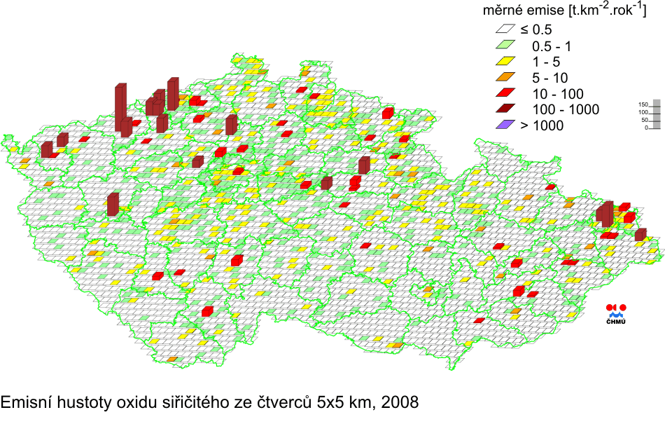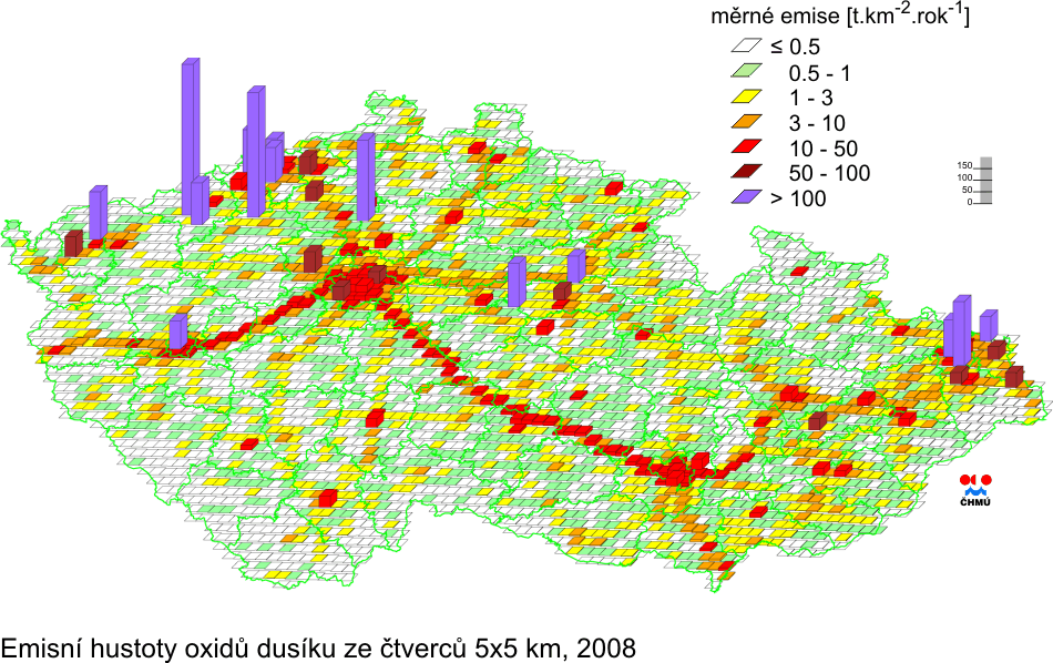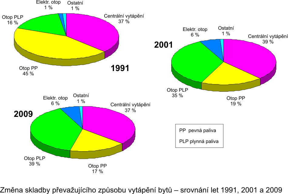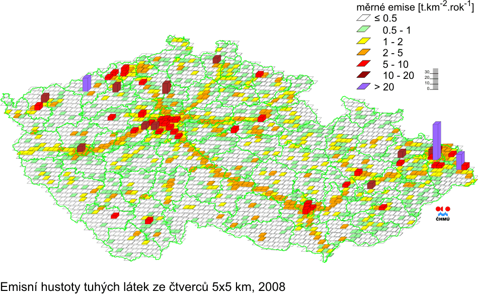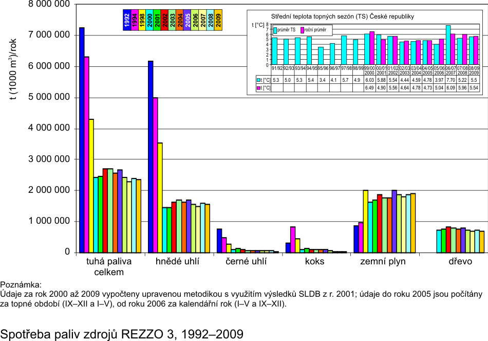 REZZO 1 Pro sběr údajů Souhrnné provozní evidence (SPE) zvláště velkých, velkých a středních zdrojů, která je podkladem pro databáze REZZO 1 a 2, byly využity formuláře, jejichž obsah byl poprvé předepsán legislativním předpisem. Provozovatelé zvláště velkých, velkých a středních zdrojů ohlašovali údaje za rok 2009 v souladu s požadavky vyhlášky MŽP č. 205/2009 Sb., která vstoupila v účinnost v srpnu 2009. Seznam údajů SPE je uveden v příloze č. 7. K výrazným změnám došlo rovněž v samotném procesu ohlašování. Podle požadavků zákona č. 25/2008 o integrovaném registru znečišťování životního prostředí (IRZ) a integrovaném systému plnění ohlašovacích povinností v oblasti životního prostředí (ISPOP) ohlašovalo cca 2500 ohlašovatelů údaje za provozovny, náležející pod IRZ, podle datového standardu, jehož součástí byla také validační kontrola, zaměřená zejména na úplnost hlášení. Pro ohlášení bylo možné využít formulář F_OVZ_SPOJ (viz www.ispop.cz). K termínu dokončení ročenky nejsou k dispozici konečné údaje o emisích všech sledovaných zdrojů, a proto jsou údaje o emisích za rok 2009 uvedeny v tabulkách jako předběžné. Údaje o celkovém množství emisí základních znečišťujících látek v roce 2008, tj. tuhých znečišťujících látek (TZL), oxidu siřičitého (SO2), oxidů dusíku (NOx), oxidu uhelnatého (CO), těkavých organických látek (VOC) a amoniaku (NH3) a podíly jednotlivých kategorií zdrojů na celkových emisích jsou uvedeny v tab. I.1.1. Předběžné údaje o množství emisí základních znečišťujících látek v roce 2009 jsou uvedeny v tab. I.1.2. Vývoj celkových emisí základních znečišťujících látek v letech 1990–2009 ukazuje obr. I.1.1. V porovnání s rokem 2008 již nedošlo k výraznějším poklesům emisí sledovaných škodlivin. Jak ukazují předběžné výsledky, proti očekávání se ekonomická krize téměř neprojevila na vývoji emisí SO2. Pokles emisí byl zaznamenán u „typických“ průmyslových emisí, jako jsou TZL a CO, což souvisí pravděpodobně s poklesem výroby železa, oceli a koksu. Porovnání meziročního vývoje zdrojů HDP vybraných odvětví a předběžných údajů o emisích v letech 2008–2009 ukazuje tab. I.1.3. V tab. I.1.4 jsou uvedeny celkové emise jednotlivých sledovaných těžkých kovů (TK) a perzistentních organických látek (POP). Emisní bilance je zpracována z podkladů databáze REZZO s využitím statistických údajů (spotřeby paliv a pohonných hmot, údaje o produkci vybraných technologií) a příslušných emisních faktorů. Mezi významné zdroje emisí TK patří energetika (velké elektrárny a teplárny), některé technologické procesy (metalurgie, výroba skla a cementu), a v případě olova také doprava. Významné emise POP pochází z malých spalovacích zdrojů, některých metalurgických procesů a emise PAH také z automobilové dopravy, výroby koksu a z obaloven živičných směsí. Změny ve skladbě spotřeby hlavních druhů paliv zdrojů REZZO 1 v letech 1990 a 2008 jsou uvedeny na obr. I.1.2. Grafy dokumentují trvale vysoký podíl spalování tuhých paliv. Vývoj spotřeby základních druhů paliv zdrojů REZZO 3 mezi lety 1992 (údaje z bilance provedené TECO Milevsko) a 2009 (předběžné údaje) ukazuje obr. I.1.3. Změnu skladby převažujícího způsobu vytápění bytů mezi lety 1991 (údaje SLDB 1991), 2001 (údaje SLDB 2001) a 2009 (aktualizovaný stav) ukazuje obr. I.1.4. Zpracování emisních údajů do map pomocí GIS je uvedeno na obr. I.1.5., I.1.6, I.1.7 a I.1.8. V síti čtverců 5 x 5 km jsou zobrazeny emisní hustoty oxidů dusíku, tuhých látek, oxidu siřičitého a oxidu uhelnatého. Podkladem pro mapy byly údaje o emisích ze stacionárních zdrojů (REZZO 1–3) a mobilních zdrojů (REZZO 4) za rok 2008, s územní desagregací emisí liniových zdrojů podle aktualizovaného sčítání vozidel z roku 2005. Hodnocení emisí Vývoj emisí znečišťujících látek, který naznačují předběžné výsledky za rok 2009, ukazuje na setrvávající tendenci snižování emisí všech znečišťujících látek. Zatímco pokles u emisí ze spalovacích zdrojů je nevýrazný, pokles technologických emisí může souviset s poklesem výkonnosti ekonomiky. Ke snížení emisí z mobilních zdrojů přispěla při takřka stálé spotřebě pohonných hmot zejména pokračující obměna vozového parku. Vliv biopaliv na hodnoty používaných emisních faktorů nebyl zatím stanoven. Tab. I.1.1 Celkové emise základních znečišťujících látek v roce 2008 – konečné údaje Tab. I.1.2 Celkové emise základních znečišťujících látek v roce 2009 – předběžné údaje Tab. I.1.3 Index změny zdrojů hrubého domácího produktu a emisí hlavních znečišťujících látek Tab. I.1.4 Celkové emise těžkých kovů a POP v letech 1990–2008 Obr. I.1.1 Celkové emise základních druhů látek znečišťujících ovzduší v České republice, 1990–2009 Obr. I.1.2 Změna skladby paliv zdrojů REZZO 1 mezi lety 1990 a 2008 (v podílech tepla obsaženého v palivu) Obr. I.1.3 Spotřeba paliv zdrojů REZZO 3, 1992–2009 Obr. I.1.4 Změny skladby vytápění bytů – srovnání let 1991, 2001 a 2009 Obr. I.1.5 Emisní hustoty oxidů dusíku ze čtverců 5x5 km, 2008 Obr. I.1.6 Emisní hustoty tuhých znečišťujících látek ze čtverců 5x5 km, 2008 Obr. I.1.7 Emise oxidu siřičitého ze čtverců 5x5 km, 2008 Obr. I.1.8 Emise oxidu uhelnatého ze čtverců 5x5 km, 2008