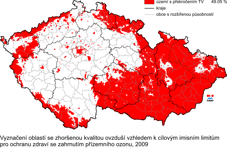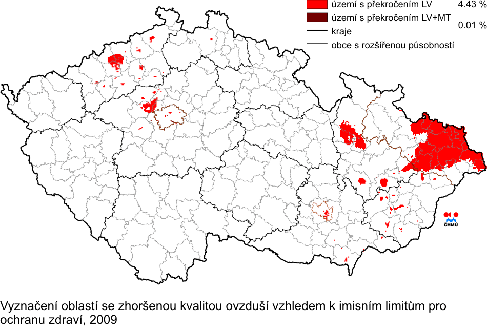 hlediska ochrany zdraví Výše popsanými postupy mapování byly připraveny mapy územního rozložení příslušných charakteristik kvality ovzduší, prezentované v předchozích částech, jak pro překročení imisních limitů, tak i pro překročení cílových imisních limitů. Oblasti s hodnotami imisních charakteristik většími než příslušné imisní (cílové) limity (červeně, případně hnědě vyznačené oblasti pro překročení limitu včetně meze tolerance) tak vymezují oblasti se zhoršenou kvalitou ovzduší. Tab. II.4.3.2 shrnuje seznam oblastí České republiky, kde byla podle výsledku mapování rozložení imisních charakteristik překročena v roce 2009 úroveň imisních limitů a zvlášť cílových imisních limitů pro ochranu zdraví lidí s uvedením procent překročení příslušného území. Tab. II.4.3.1. pak sumarizuje za rok 2009 oblasti překročení imisních limitů zvýšených o meze tolerance pro ochranu zdraví lidí. Tabulky ukazují procenta překročení příslušných imisních limitů, resp. cílových imisních limitů pro odpovídající území pro jednotlivé komponenty a imisní charakteristiky a v souhrnu jsou pak uvedeny oblasti, ve kterých je překročen alespoň jeden imisní limit, resp. cílový imisní limit některé z komponent. Procenta překročení uvedená v souhrnu v tab. II.4.3.2 odpovídají procentům území uvedeného administrativního celku, ve kterém je překročen aspoň jeden imisní limit z uvedeného souboru limitů pro ochranu zdraví lidí. Mapa na obr. II.4.3.1 znázorňuje vymezení oblastí se zhoršenou kvalitou ovzduší vzhledem k imisním limitům, mapa na obr. II.4.3.2 znázorňuje vymezení oblastí s překročením cílových imisních limitů pro ochranu zdraví lidí bez zahrnutí přízemního ozonu a na obr. II.4.3.3 se zahrnutím přízemního ozonu. Tabulka II.4.3.3 pak obsahuje seznam administrativních celků, kde byl překročen cílový imisní limit O3 pro ochranu zdraví v rámci oblastí České republiky a % plochy překročení daného územního celku. Troposférický ozon je uveden v samostatném přehledu, protože je zřejmé, že opatření pro snížení koncentrací překračujících cílový imisní limit, případně dlouhodobé imisní cíle pro ozon, má smysl přijímat na regionální a národní úrovni.