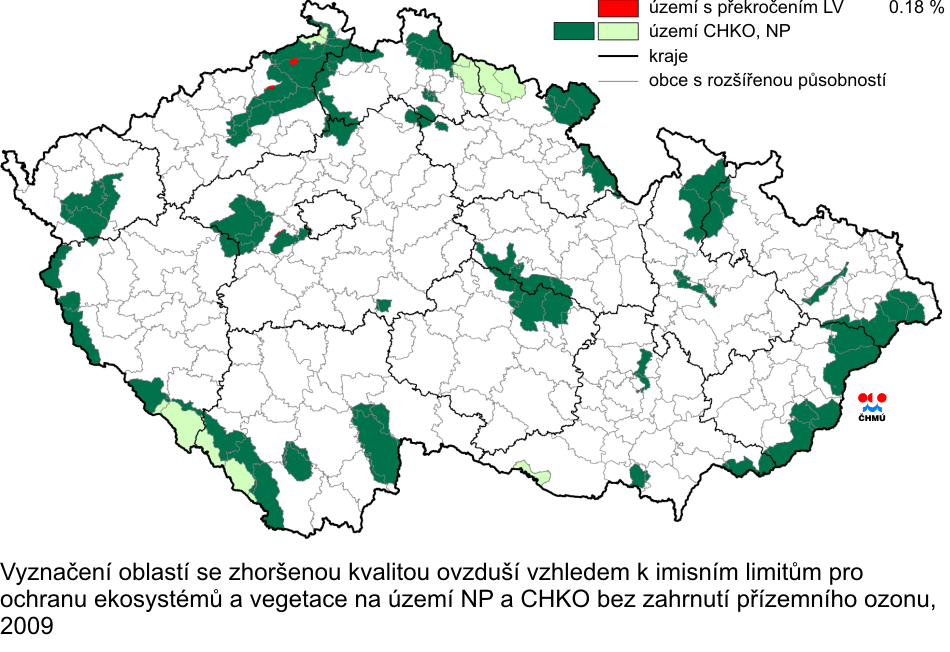Na základě mapování rozložení imisních charakteristik pro rok 2009 relevantních z hlediska ochrany ekosystémů a vegetace prezentovaných v kap. II.4.2.2.1, II.4.2.2.2 a II.4.2.2.3 je znázorněno rozložení ročních a zimních průměrných koncentrací SO2 a ročních průměrných koncentrací NOx pro ochranu ekosystémů a vegetace. V roce 2009 nedošlo k překročení imisních limitů pro SO2 a NOx pro ochranu ekosystémů/vegetace na žádné lokalitě s monitorovací stanicí, která je klasifikována jako venkovská. Mapa na obr. II.4.3.4 znázorňuje vymezení oblastí se zhoršenou kvalitou ovzduší vzhledem k imisním limitům pro ochranu ekosystémů a vegetace na území národních parků a chráněných krajinných oblastí bez zahrnutí přízemního ozonu, mapa na obr. II.4.3.5 pak se zahrnutím přízemního ozonu. Pro informaci je uvedena tab. II.4.3.4, ve které je uvedeno překročení imisního limitu (SO2, NOx) a cílového imisního limitu (AOT40) pro ochranu ekosystémů a vegetace v rámci NP a CHKO v % plochy NP a CHKO v roce . Tyto hodnoty byly spočítány na základě příslušných map imisních charakteristik. Tab. II.4.3.1 Překročení LV+MT v rámci zón/aglomerací a obcí s rozšířenou