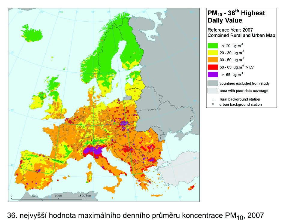 evropském měřítku. V případě PM10 jde o mapy ročního průměru a 36. nejvyšší