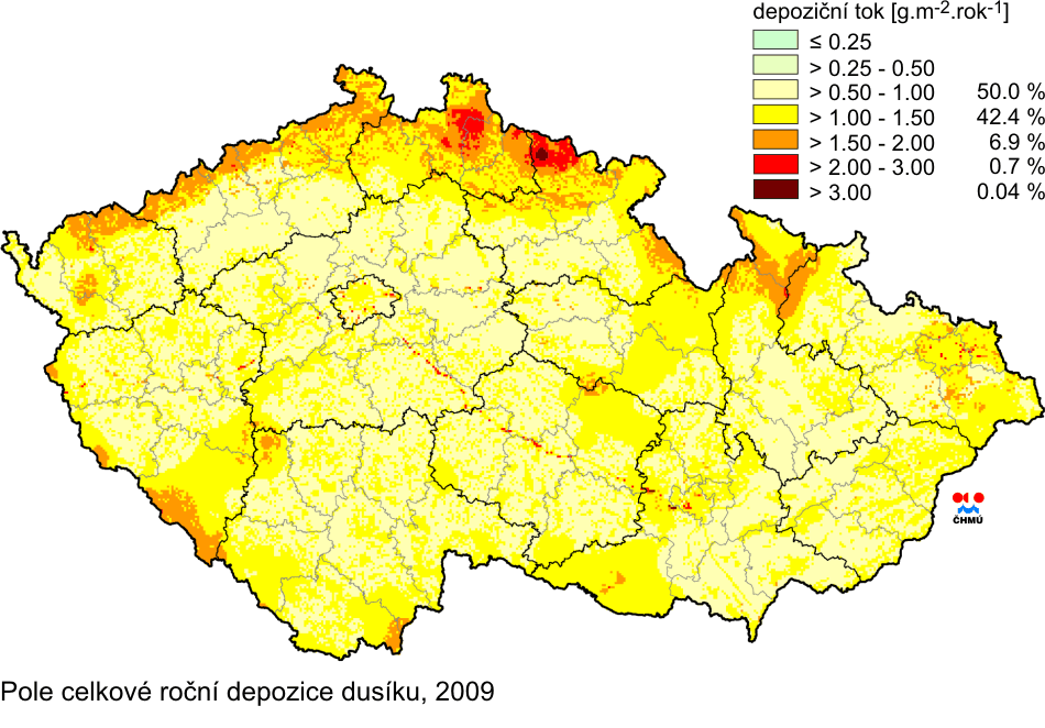 V roce 2009 byla celková depozice dusíku rovna hodnotě 63 844 t N (ox+red).
