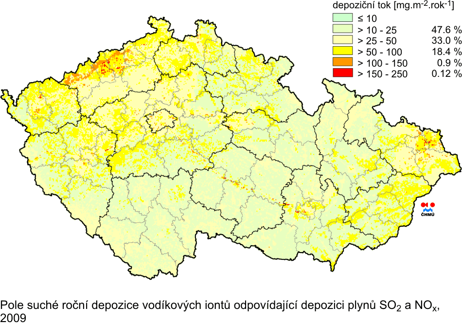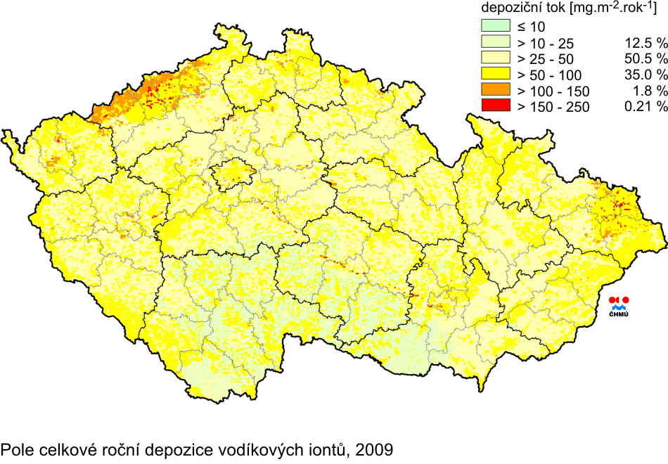 plochu celé ČR o 50 %, snížení hodnot suché depozice vodíkových iontů