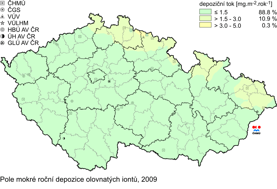 mokré depozice některých složek (převážně síranů, vodíkových iontů a olovnatých