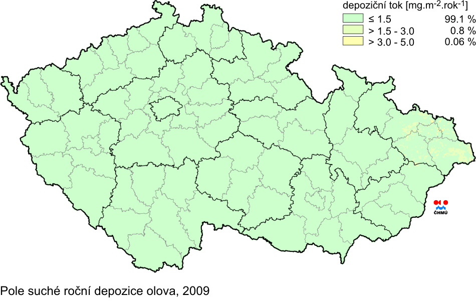 hor a Žďárských vrchů. Mapa suché depozice olova vypadá také obdobně jako v
