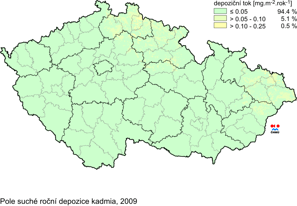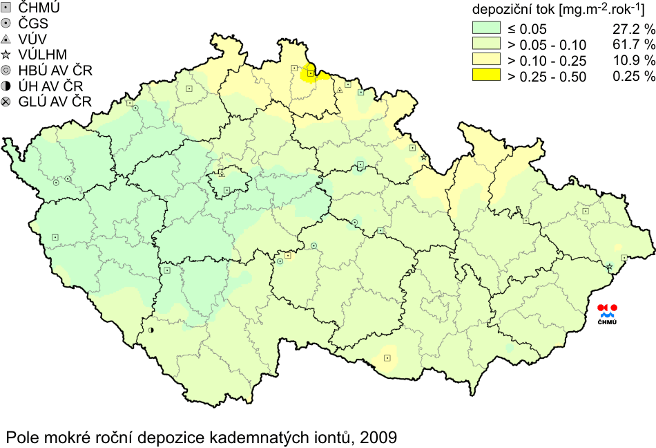 Mokrá depozice kadmia byla v roce 2009 srovnatelná s předchozím rokem.