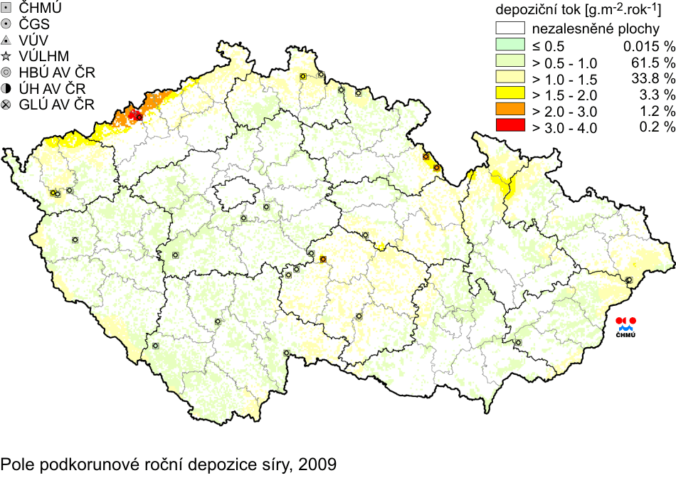 Mapové zobrazení podkorunové depozice síry bylo vytvořeno pro místa s porosty