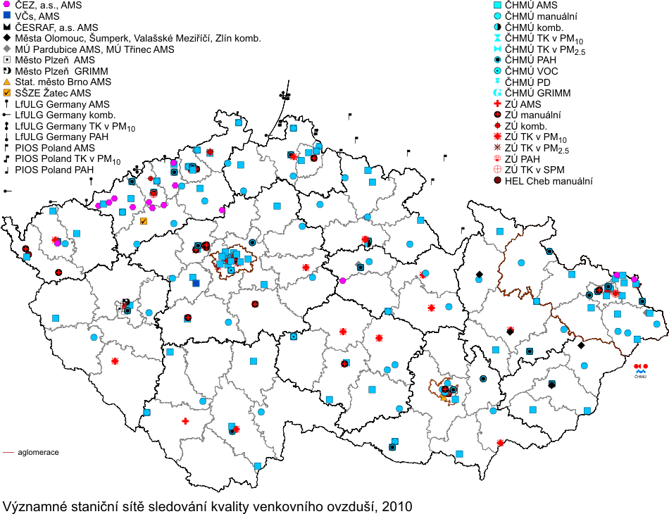 naměřená data do databáze Informačního systému kvality ovzduší (ISKO). Tab. II.1.2 uvádí přehled počtu lokalit podle vlastníka, kde se měří na automatizovaných monitorovacích stanicích (AMS) základní znečišťující látky. Na stanicích sítě AMS jsou znečišťující látky měřeny kontinuálními analyzátory a naměřené koncentrace jsou jako hodinové průměry přenášeny v reálném čase prostřednictvím komutovaných linek nebo radiovým přenosem k dalšímu zpracování. Tab. II.1.3 uvádí pro jednotlivé kraje přehled počtu lokalit podle vlastníka, kde se měří na AMS další znečišťující látky, včetně doprovodných meteorologických veličin. Tab. II.1.4 uvádí přehled počtu lokalit v jednotlivých krajích, kde se uvedené znečišťující látky sledují manuálními postupy. Tab. II.1.5 pak uvádí celkové počty lokalit se speciálním měřením manuálními postupy podle vlastníka v jednotlivých krajích. Hustotu staničních sítí v jednotlivých oblastech České republiky a zastoupení monitorujících organizací vystihuje mapa na obr. II.1.1. Vývoj monitoringu základních znečišťujících látek od roku 1969 pro uvedené organizace a typy sítí je graficky znázorněn na obr. II.1.2, naměřená data jsou archivována v imisní databázi ISKO. Důležitým vodítkem při tvorbě map imisních charakteristik prezentovaných v ročence, je klasifikace měřicích stanic, která byla realizována v rámci projektu VaV740/2/00 „Vyhodnocení připravenosti České republiky splnit požadavky na kvalitu ovzduší podle směrnic EU a Konvence LRTAP“ [3] a dále se rozvíjí. Tato klasifikace lokalit vychází z Rozhodnutí Rady 97/101/EC o výměně informací (EoI) [4] a kritérií pro Evropskou síť kvality ovzduší EUROAIRNET [5]. Požadavky plynoucí z Rozhodnutí Rady 97/101/EC jsou závazné pro členské země EU. Vzhledem k tomu, že se jedná o jedinou oficiální evropskou