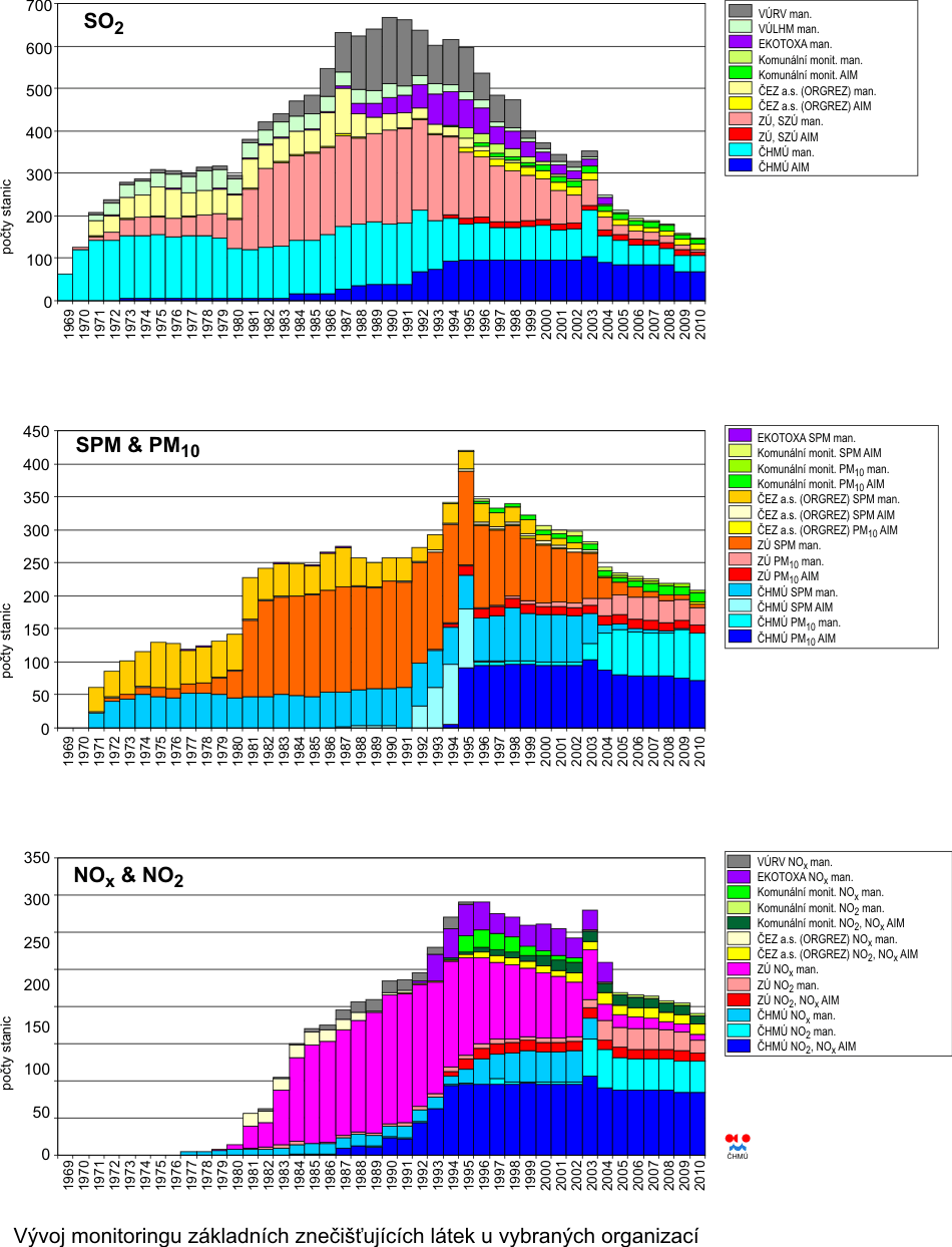 Další podrobnosti o staničních sítích, použitých metodách měření, mezích detekce jednotlivých používaných metod, podrobný aktuální seznam stanic v územním členění a další podrobné údaje uvádí souhrnný tabelární přehled [2]. Míru využitelnosti dat dodaných za hodnocený rok ze staničních sítí institucí přispívajících do imisní databáze ISKO vyjadřují tabulky II.1.7 až II.1.10. Tabulky prezentují formou zlomku počet monitorovacích stanic dané sítě, které pro uvedenou veličinu splnily kriteria pro platnost ročních imisních charakteristik, k celkovému počtu stanic, uvedených ve jmenovateli zlomku, měřících v dané síti uvedenou veličinu. Pod zlomkem je pak tento poměr platných dat z ročního souboru naměřených a verifikovaných dat dodaných pro příslušnou veličinu danou organizací/sítí vyjádřen v procentech. Platnost dat je stanovena na základě velikosti nejdelšího souvislého ročního výpadku měření (NSV) a minimálního požadovaného procenta (MP) platných údajů z ročního souboru dat. Nejdelší souvislý roční výpadek vyjádřený počtem dní a minimální procento požadovaných platných údajů se jako základní parametry kritéria úplnosti a rovnoměrnosti údajů pro výpočet ročních imisních charakteristik vyhodnocují při celoročním zpracování a ukládají se jako součást ročního datového souboru, pro každou stanici a veličinu. Kritérium MP≥66 % a NSV≤40 je použito pro platný roční aritmetický průměr koncentrací dané látky a je zároveň kritériem pro určení míry využitelnosti dat v tab. II.1.7–II.1.10. Jak bylo zmíněno dříve, během let 2003 a 2004 došlo k výrazným změnám v měřicí síti ČHMÚ (státní imisní síti). Rozmístění měřicích míst bylo určeno s ohledem na cíle měření dané příslušnými směrnicemi EU, zákonem č. 86/2002 Sb. o ochraně ovzduší a nařízením vlády č. 350/2002 Sb. Tyto změny byly v roce 2004 dokončeny a měřicí programy a způsoby měření znečišťujících látek zajišťují sledování kvality ovzduší na celém území ČR, zejména pak v oblastech se zhoršenou kvalitou ovzduší. Od roku 2006 se sledování a vyhodnocování kvality ovzduší opírá o nařízení vlády č. 597/2006 Sb, které bylo 2. února 2011 novelizováno nařízením vlády č. 42/2011 Sb. Tab. II.1.6 Klasifikace stanic podle EoI Tab. II.1.7 Procenta platných dat ze stanic s kontinuálním měřením, 2010 Tab. II.1.8 Procenta platných dat ze stanic s manuálním měřením, 2010 Tab. II.1.9 Procenta platných dat ze stanic s měřením meteorologických prvků, 2010 Tab. II.1.10 Procenta dat ostatních měření, 2010 Obr. II.1.1 Významné staniční sítě sledování kvality venkovního ovzduší, stav 2010 Obr. II.1.2 Vývoj monitoringu základních znečišťujících látek u vybraných organizací