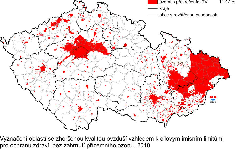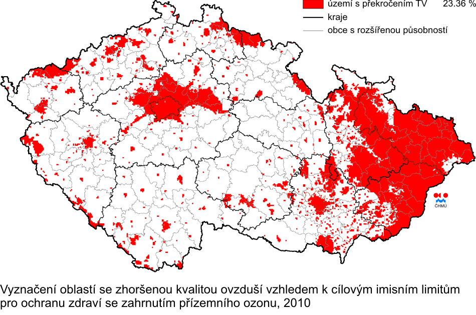 hlediska ochrany zdraví Výše popsanými postupy mapování byly připraveny mapy územního rozložení příslušných charakteristik kvality ovzduší, prezentované v předchozích částech, jak pro překročení imisních limitů, tak i pro překročení cílových imisních limitů. Oblasti s hodnotami imisních charakteristik většími než příslušné (cílové) imisní limity (červeně) tak vymezují oblasti se zhoršenou kvalitou ovzduší. Tab. II.4.3.1 shrnuje seznam oblastí České republiky, kde byla podle výsledku mapování rozložení imisních charakteristik překročena v roce 2010 úroveň imisních limitů a zvlášť cílových imisních limitů pro ochranu zdraví lidí alespoň pro jednu znečišťující látku, s uvedením procent překročení příslušného území. Procenta překročení uvedená v souhrnu v tab. II.4.3.1 odpovídají procentům území uvedeného administrativního celku, ve kterém je překročen aspoň jeden imisní limit z uvedeného souboru limitů pro ochranu zdraví lidí. Mapa na obr. II.4.3.1 znázorňuje vymezení oblastí se zhoršenou kvalitou ovzduší vzhledem k imisním limitům, mapa na obr. II.4.3.2 znázorňuje vymezení oblastí s překročením cílových imisních limitů pro ochranu zdraví lidí bez zahrnutí přízemního ozonu a na obr. II.4.3.3 se zahrnutím přízemního ozonu. Tabulka II.4.3.2 pak obsahuje seznam administrativních celků, kde byl překročen cílový imisní limit O3 pro ochranu zdraví v rámci oblastí České republiky a % plochy překročení daného územního celku. Troposférický ozon je uveden v samostatném přehledu, protože je zřejmé, že opatření pro snížení koncentrací překračujících cílový imisní limit, případně dlouhodobé imisní cíle pro ozon, má smysl přijímat na regionální a národní úrovni.