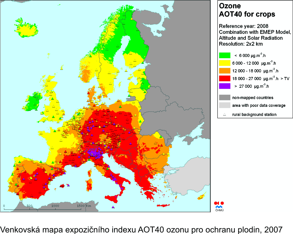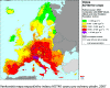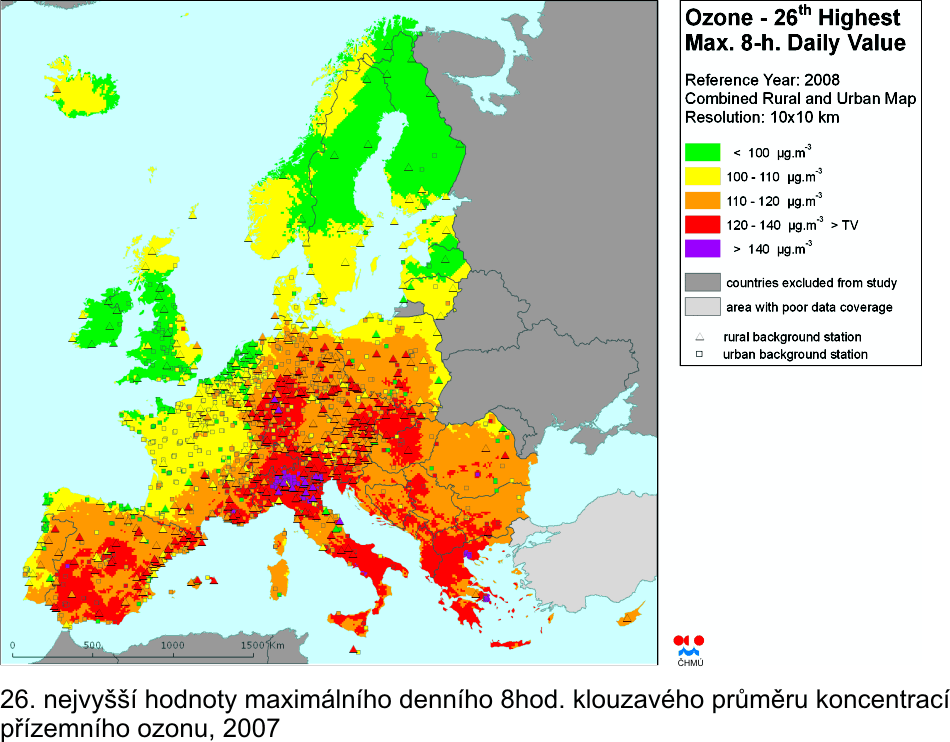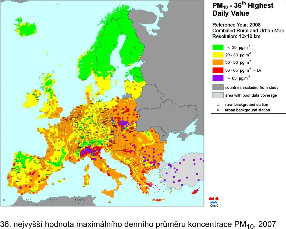 II.4.5 Evropa Na obr. II.4.5.1–II.4.5.4 jsou prezentovány mapy koncentrací PM10 a ozonu v evropském měřítku. V případě PM10 jde o mapy ročního průměru a 36. nejvyšší denní hodnoty, v případě ozonu jednak o 26. nejvyšší denní maximální 8hodinovou hodnotu, jednak o index AOT40 pro vegetaci. Ve všech případech jde o mapy za rok 2008, tj. nejnovější publikované evropské mapy. Mapy byly vytvořeny v rámci konsorcia ETC/ACC (jehož je ČHMÚ součástí) pro Evropskou agenturu pro životní prostředí [34]. Mapy byly vytvořeny kombinací měřených a doplňkových dat, sloučením venkovské a městské mapy znečištění (s výjimkou AOT40, kde je prezentována pouze venkovská mapa), v rozlišení 10x10 km. Evropské mapy dávají kontext mapám znečištění ovzduší České republiky (byť v roce 2008 bylo znečištění ovzduší v celoevropském měřítku na nižší úrovni než v roce 2010). V případě PM10 lze nahlédnout, že ostravsko-katovická oblast patří – spolu s Pádskou nížinou v Itálii a některými oblastmi Balkánu – k nejvíce znečištěným oblastem v Evropě. V případě přízemního ozonu jde u České republiky o průměrné znečištění odpovídající naší zeměpisné poloze v rámci Evropy.