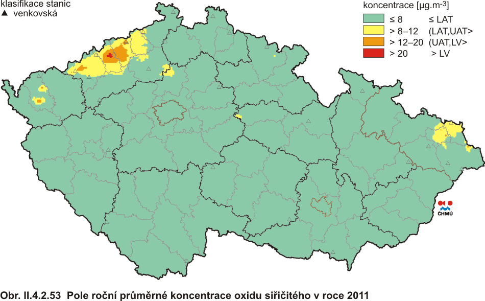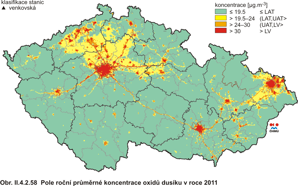 Obr. II.4.3.1 Vyznačení oblastí s překročenými imisními limity pro ochranu zdraví, 2011 Obr. II.4.3.2 Vyznačení oblastí s překročenými cílovými imisními limity pro ochranu zdraví bez zahrnutí přízemního ozonu, 2011 Obr. II.4.3.3 Vyznačení oblastí s překročenými cílovými imisními limity pro ochranu zdraví se zahrnutím přízemního ozonu, 2011 Obr. II.4.3.4 Vyznačení oblastí s překročenými imisními limity pro ochranu ekosystémů a vegetace na území NP a CHKO bez zahrnutí přízemního ozonu, 2011 Obr. II.4.3.5 Vyznačení oblastí s překročenými imisními limity pro ochranu ekosystémů a vegetace na území NP a CHKO se zahrnutím přízemního ozonu, 2011 Obr. II.4.3.6 Překročení imisního limitu (LV) a cílového imisního limitu (TV)