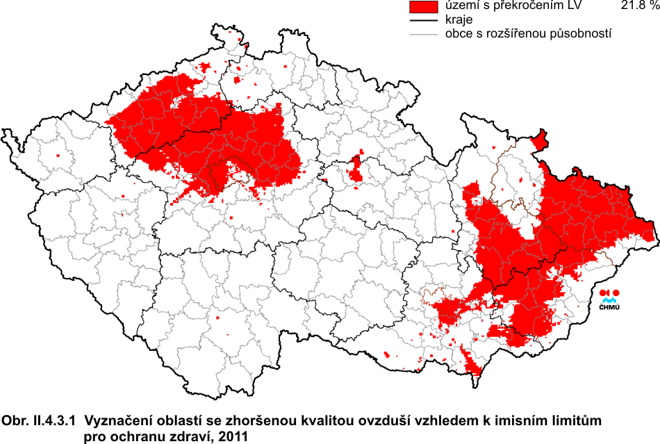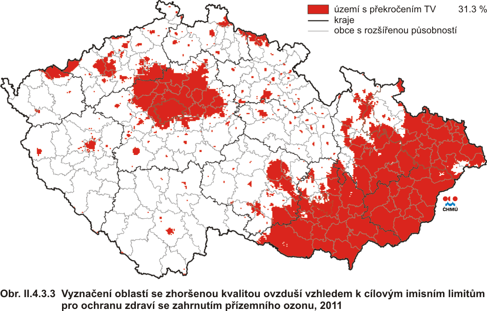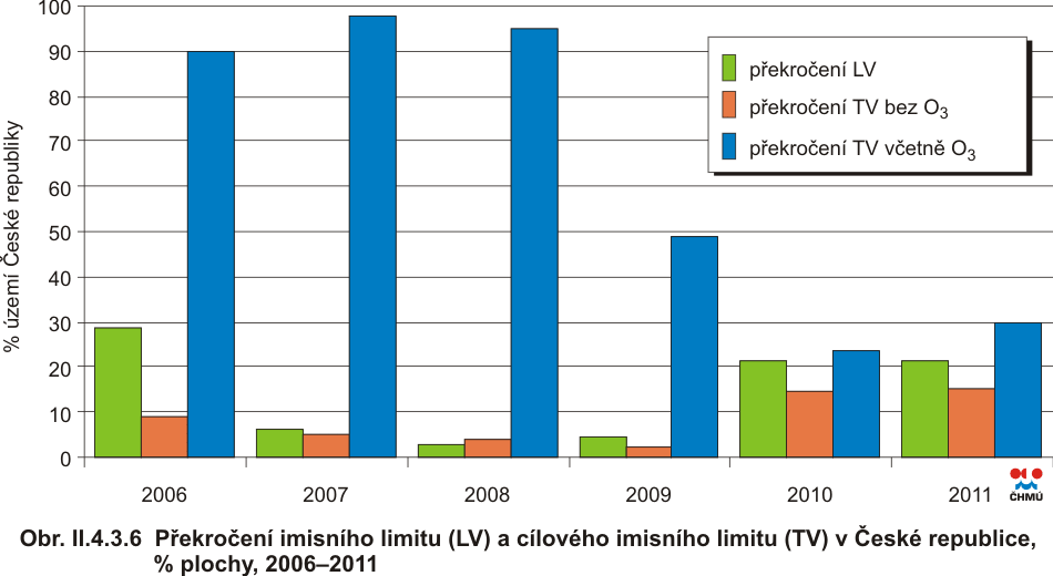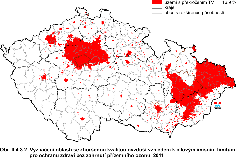hlediska ochrany zdraví Bylo vyhodnoceno překračování imisních limitů pro roční průměrné koncentrace PM10, NO2, olova, benzenu, překračování 8hodinového limitu CO, překračování denních limitů pro PM10 a SO2 a překračování hodinových imisních limitů pro SO2 a NO2. Dále bylo vyhodnoceno překračování cílových imisních limitů pro roční průměrné koncentrace benzo(a)pyrenu, kadmia, arsenu a niklu a pro nejvyšší max. denní 8hod. koncentraci přízemního ozonu. Dříve popsanými postupy mapování byly připraveny mapy územního rozložení příslušných imisních charakteristik kvality ovzduší, prezentované v předchozích částech, jak pro překročení imisních limitů, tak i pro překročení cílových imisních limitů. Oblasti s hodnotami imisních charakteristik vyššími než příslušné (cílové) imisní limity jsou vymezeny červeně. Mapa OZKO podává ucelenou informaci o kvalitě ovzduší na území ČR v roce 2011. V hodnoceném roce bylo 21,8 % území ČR vymezeno jako OZKO, kde žije přibližně 50,8 % obyvatel (obr. II.4.3.1). Při podrobnější analýze (tab. II.4.3.1) je jasné, že zařazení zón a aglomerací (rozdělených na obce s rozšířenou působností) do OZKO je v naprosté většině zapříčiněno překročením denního imisního limitu pro suspendované částice PM10. V některých oblastech, zejména dopravně a průmyslově zatížených, se na zařazení území do těchto oblastí může podílet i překročení imisního limitu pro jinou látku. Jedná se o NO2 (často v aglomeracích Praha a Brno) a benzen (často v aglomeraci Moravskoslezský kraj). Podobně vyhodnocení území jako oblastí s překročením alespoň jednoho cílového imisního limitu bez zahrnutí ozonu je důsledkem zejména překročení cílového imisního limitu pro benzo(a)pyren. V roce 2011 bylo 16,9 % území ČR vyhodnoceno jako oblasti s překročením alespoň jednoho cílového imisního limitu bez zahrnutí ozonu (obr. II.4.3.2). Pomocí podrobnější analýzy v rámci jednotlivých aglomerací a zón (tab. II.4.3.1) lze konstatovat, že i v roce 2011 se na vymezení oblastí nejvíce podílely nadlimitní koncentrace benzo(a)pyrenu, dále i koncentrace částic PM2,5, As a výjimečně i Ni. Po zahrnutí přízemního ozonu bylo oblastí s překročením alespoň jednoho cílového imisního limitu vymezeno 31,3 % území ČR (obr. II.4.3.3, tab. II.4.3.2). Je odhadováno, že v oblastech s překročením alespoň jednoho cílového imisního limitu žilo v roce 2011 přibližně 61,4 % obyvatel; po zahrnutí ozonu se odhad zvýšil na 67,2 % obyvatel. Tyto tři typy oblastí jsou vymezovány od roku 2006 (obr. II.4.3.3). Za tento časový úsek nelze, s výjimkou vlivu přízemního ozonu, konstatovat výraznou změnu situace. Stále nezanedbatelná část území ČR je vystavena nadlimitním koncentracím znečišťujících látek. Při pohledu na mapy (obr. II.4.3.1, obr. II.4.3.2) je jasné, že se navíc jedná o oblasti s vysokou hustotou zalidnění.