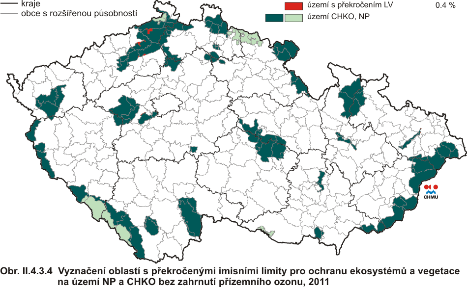 Na základě mapování rozložení imisních charakteristik pro rok 2011 relevantních z hlediska ochrany ekosystémů a vegetace prezentovaných v kap. II.4.2.2.1, II.4.2.2.2 a II.4.2.2.3 je znázorněno rozložení ročních a zimních průměrných koncentrací SO2 (obr. II.4.2.53 a II.4.2.54) a ročních průměrných koncentrací NOx (obr. II.4.2.58) pro ochranu ekosystémů a vegetace. Mapa na obr. II.4.3.5 znázorňuje vymezení oblastí se zhoršenou kvalitou ovzduší vzhledem k imisním limitům pro ochranu ekosystémů a vegetace na území národních parků a chráněných krajinných oblastí bez zahrnutí přízemního ozonu, mapa na obr. II.4.3.6 pak se zahrnutím přízemního ozonu. Pro informaci je uvedena tab. II.4.3.3, ve které je uvedeno překročení imisního limitu (SO2, NOx) a cílového imisního limitu (AOT40) pro ochranu ekosystémů a vegetace v rámci NP a CHKO v % plochy NP a CHKO v roce 2011. Tyto hodnoty byly spočítány na základě příslušných map imisních charakteristik.