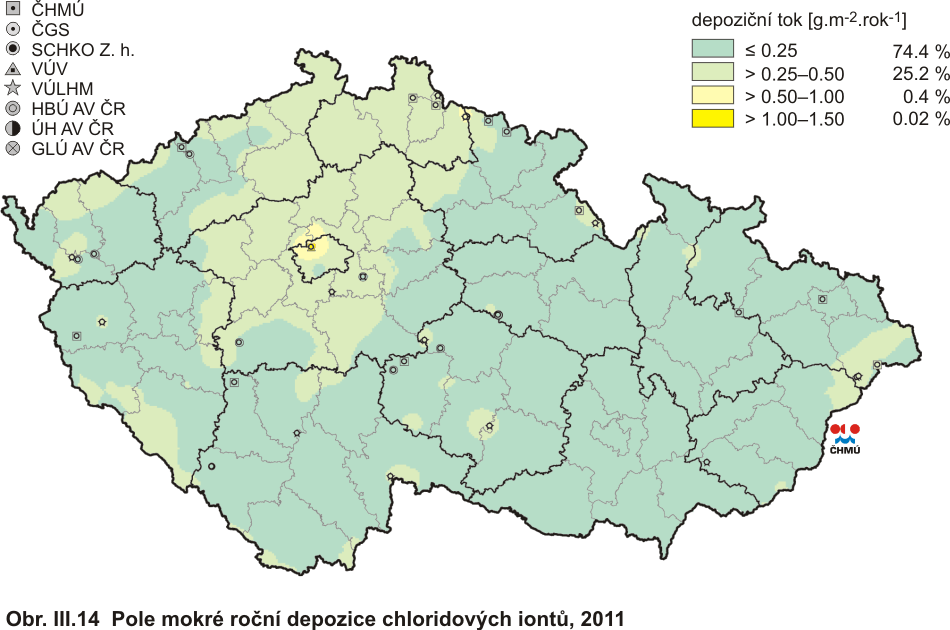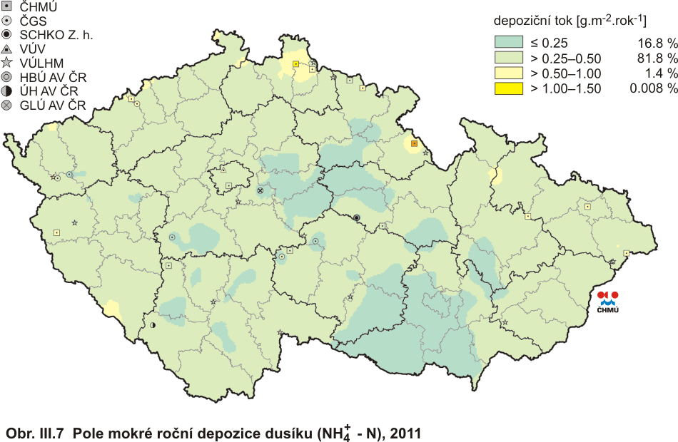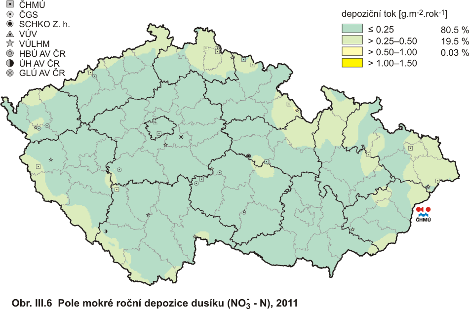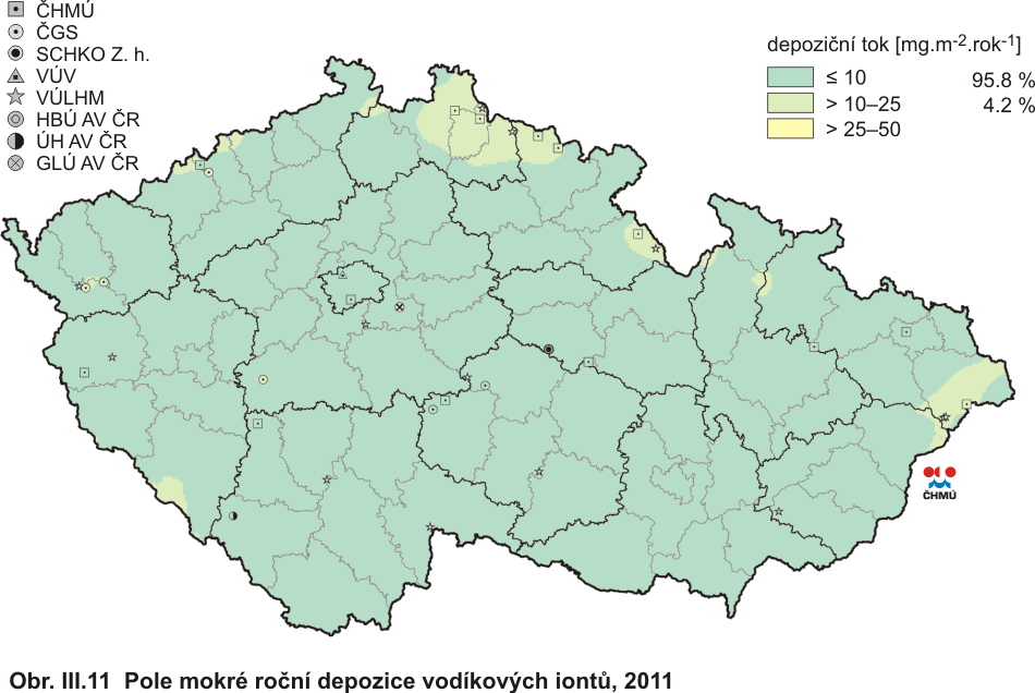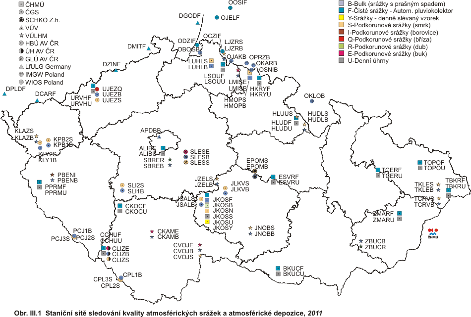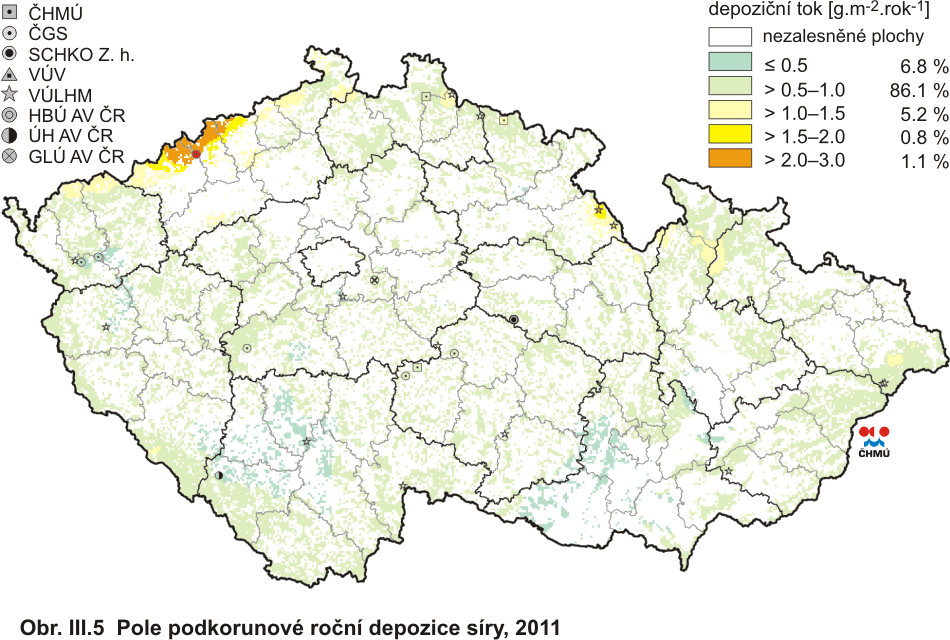 Obr. III.1 Staniční sítě sledování kvality atmosférických srážek a atmosférické depozice, 2011 Obr. III.2 Pole mokré roční depozice síry (SO42-–S), 2011 Obr. III.3 Pole suché roční depozice síry (SO2–S), 2011 Obr. III.4 Pole celkové roční depozice síry, 2011 Obr. III.5 Pole podkorunové roční depozice síry, 2011 Obr. III.6 Pole mokré roční depozice dusíku (NO3-–N), 2011 Obr. III.7 Pole mokré roční depozice dusíku (NH4+–N), 2011 Obr. III.8 Pole celkové mokré roční depozice dusíku, 2011 Obr. III.9 Pole suché roční depozice dusíku (NOx–N), 2011 Obr. III.10 Pole celkové roční depozice dusíku, 2011 Obr. III.11 Pole mokré roční depozice vodíkových iontů, 2011 Obr. III.12 Pole suché roční depozice vodíkových iontů odpovídající depozici plynů SO2 a NOx, 2011 Obr. III.13 Pole celkové roční depozice vodíkových iontů, 2011 Obr. III.14 Pole mokré roční depozice chloridových iontů, 2011 Obr. III.15 Pole mokré roční depozice olovnatých iontů, 2011 Obr. III.16 Pole suché roční depozice olova, 2011 Obr. III.17 Pole mokré roční depozice kademnatých iontů, 2011 Obr. III.18 Pole suché roční depozice kadmia, 2011 Obr. III.19 Pole mokré roční depozice nikelnatých iontů, 2011 Obr. III.20 Vývoj roční depozice síry (SO42-–S, SO2–S)