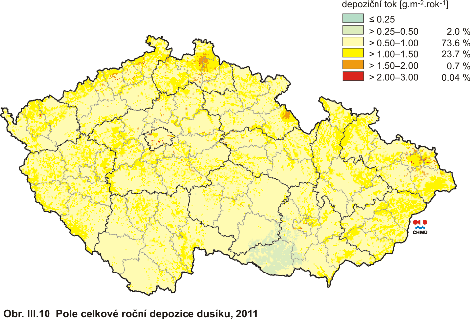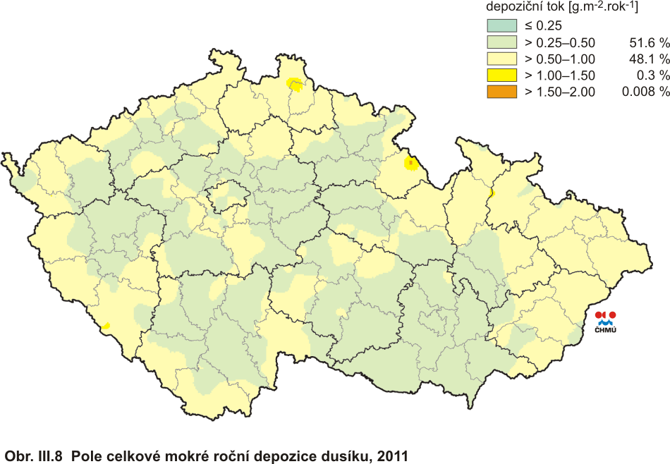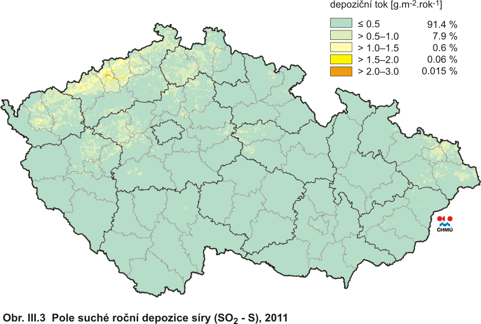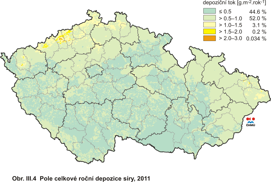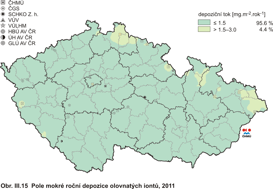 Obr. III.1 Staniční sítě sledování kvality atmosférických srážek a atmosférické depozice, 2011 Obr. III.2 Pole mokré roční depozice síry (SO42-–S), 2011 Obr. III.3 Pole suché roční depozice síry (SO2–S), 2011 Obr. III.4 Pole celkové roční depozice síry, 2011 Obr. III.5 Pole podkorunové roční depozice síry, 2011 Obr. III.6 Pole mokré roční depozice dusíku (NO3-–N), 2011 Obr. III.7 Pole mokré roční depozice dusíku (NH4+–N), 2011 Obr. III.8 Pole celkové mokré roční depozice dusíku, 2011 Obr. III.9 Pole suché roční depozice dusíku (NOx–N), 2011 Obr. III.10 Pole celkové roční depozice dusíku, 2011 Obr. III.11 Pole mokré roční depozice vodíkových iontů, 2011 Obr. III.12 Pole suché roční depozice vodíkových iontů odpovídající depozici plynů SO2 a NOx, 2011 Obr. III.13 Pole celkové roční depozice vodíkových iontů, 2011 Obr. III.14 Pole mokré roční depozice chloridových iontů, 2011 Obr. III.15 Pole mokré roční depozice olovnatých iontů, 2011 Obr. III.16 Pole suché roční depozice olova, 2011 Obr. III.17 Pole mokré roční depozice kademnatých iontů, 2011 Obr. III.18 Pole suché roční depozice kadmia, 2011 Obr. III.19 Pole mokré roční depozice nikelnatých iontů, 2011 Obr. III.20 Vývoj roční depozice síry (SO42-–S, SO2–S)