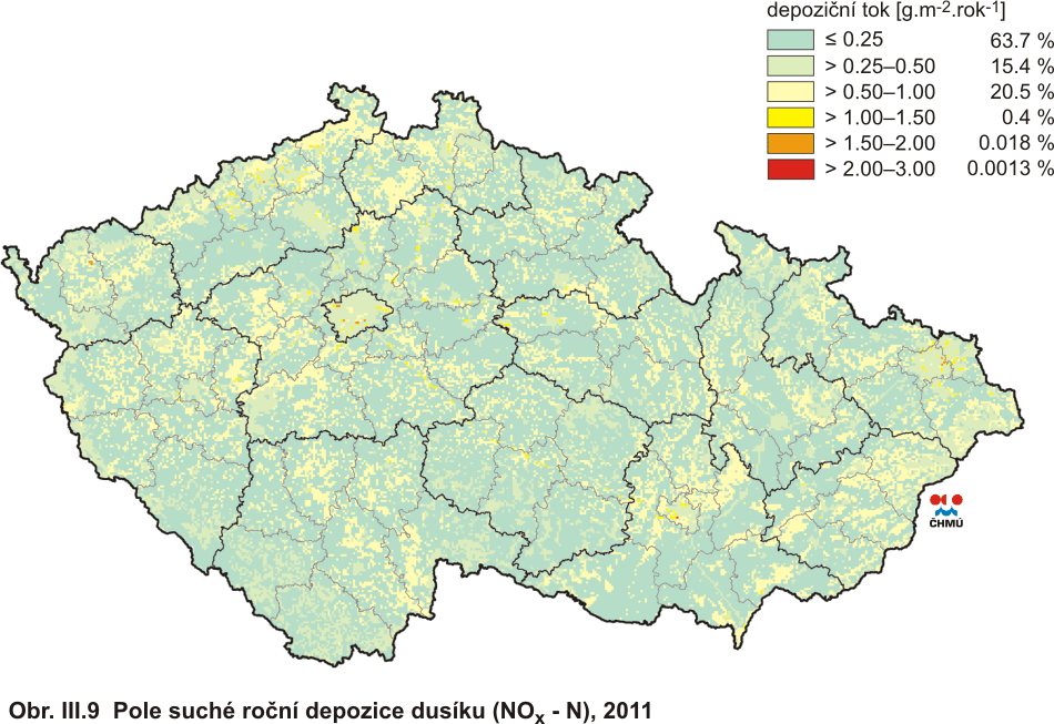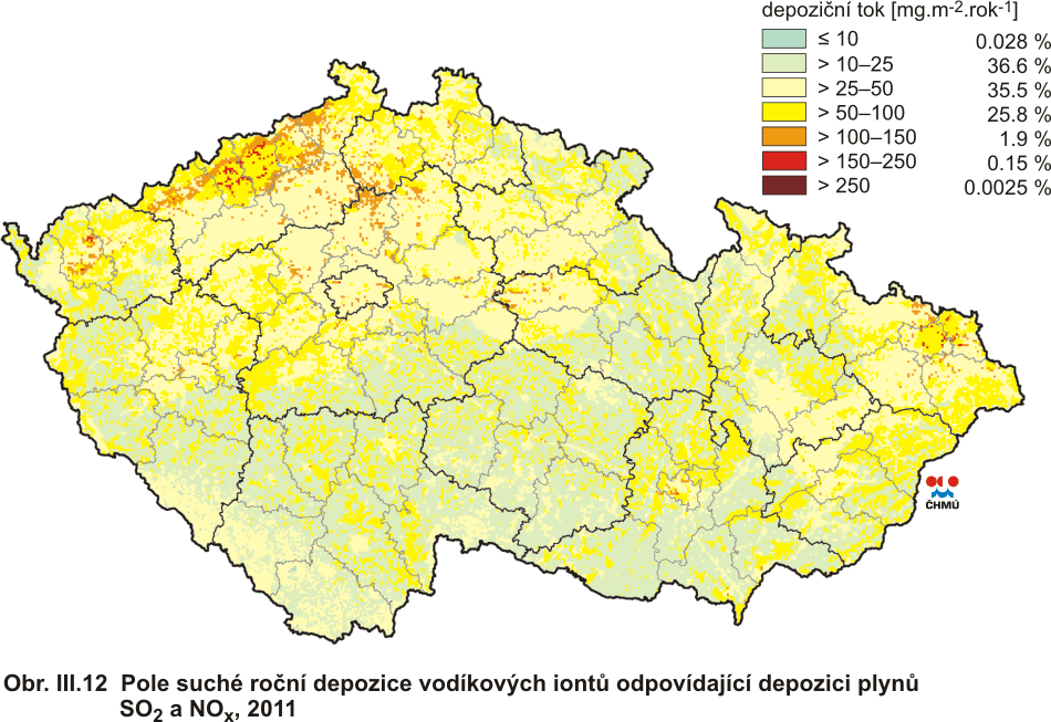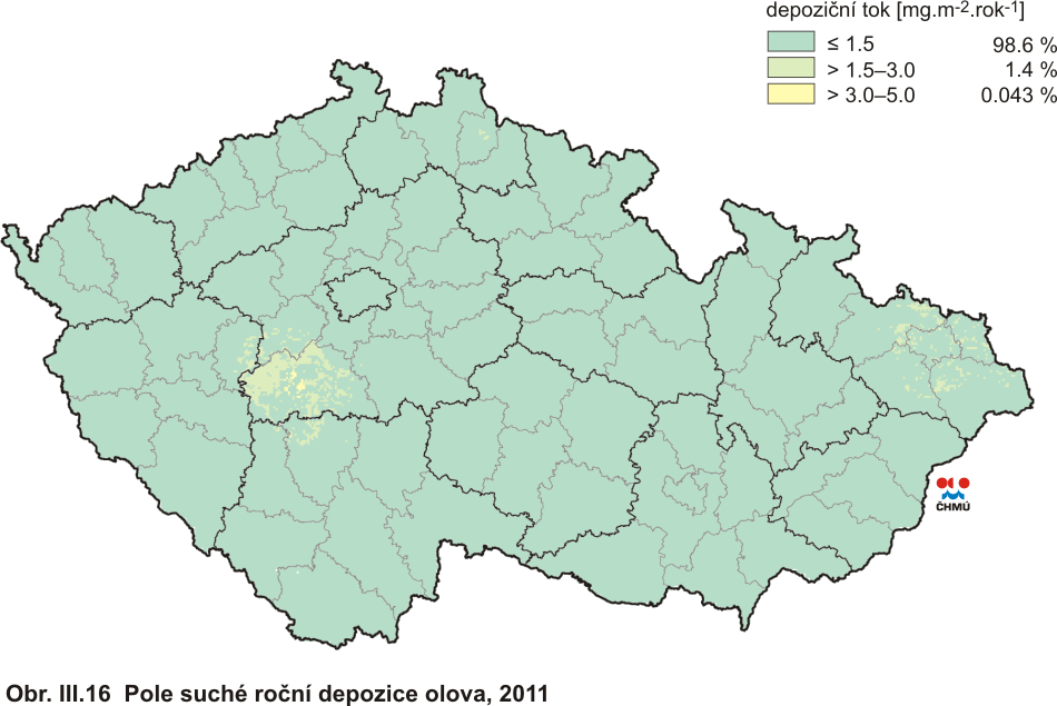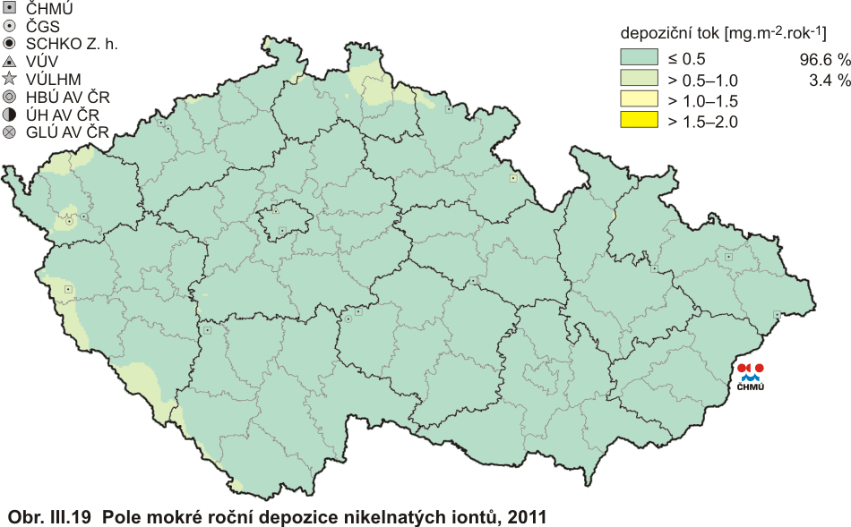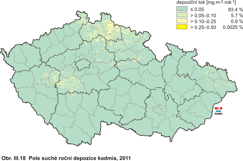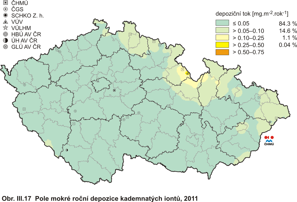 iontů vznikla součtem map depozice mokré a suché. Mapové zobrazení podkorunové depozice síry bylo vytvořeno pro místa s porosty z pole koncentrací síry v podkorunových srážkách (tzv. throughfall) a z verifikovaného pole srážek procentuálně modifikovaného množstvím srážek naměřeným pod porosty na jednotlivých stanicích (v rozsahu 55–100 % srážkového úhrnu na volné ploše pro rok 2011). Podkorunová depozice obecně zahrnuje mokrou vertikální a horizontální depozici (z mlh, nízkých oblačností a z námraz) a suchou depozici částic a plynů v porostech. Pro síru, pro kterou je vnitřní koloběh porosty zanedbatelný, by měla být dobrým odhadem depozice celkové. Mapy mokré depozice (s blíže nedefinovatelným množstvím depozice suché) těžkých kovů Pb, Cd a Ni byly konstruovány na základě koncentrací těchto kovů ve srážkách s prašným spadem „bulk“ na jednotlivých stanicích. Pole suché depozice olova a kadmia obsažených v aerosolu byla připravena z polí koncentrací těchto kovů v ovzduší (resp. na základě imisního pole ročního průměru koncentrací PM10 a hodnot interpolace IDW podílů příslušného kovu v prachu). Pro hodnotu depozičních rychlostí pro kadmium obsažené v aerosolu byly použity hodnoty 0,27 cm.s-1 pro les a 0,1 cm.s-1 pro bezlesý terén, pro olovo 0,25 cm.s-1 pro les a 0,08 cm.s-1 pro bezlesý terén [21]. Ke kontrole dat o kvalitě srážek se rutinně používá výpočet