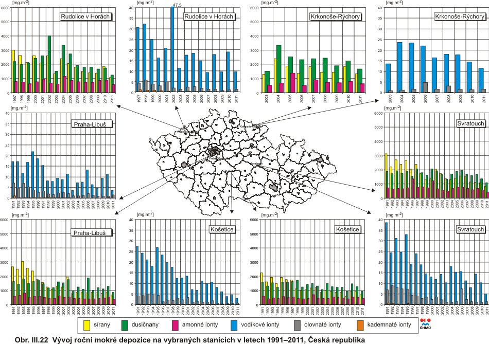Vývoj roční mokré depozice hlavních složek na vybraných stanicích České republiky (obr. III.22) vykazuje po poklesu mokré depozice některých složek (převážně síranů, vodíkových iontů a olovnatých iontů) ve 2. polovině 90. let nyní spíše stagnující stav. Pokles depozice síranů byl zřejmý jak na relativně exponovaných předměstkých stanicích, tak i na pozaďových stanicích, jako např. Košetice a Svratouch. Podstatný byl pokles na stanici v Ústí n. L.-Kočkov, kde mokrá depozice síranů po roce 1995 poklesla o 60 % a současně se projevil i pokles dalších látek (NO3-, NH4+, Pb). S vývojem depozice síry a dusíku lze sledovat vývoj vzájemného poměru těchto prvků v atmosférických srážkách související s vývojem emisí jednotlivých sloučenin. Od 2. poloviny 90. let lze na některých stanicích pozorovat mírný nárůst poměru dusičnanů a síranů. Vývoj poměru koncentrací dusičnanů a síranů za posledních 12 let v průměru pro stanice ČHMÚ je patrný na obr. III.21. Tab. III.1 Průměrné hodnoty depozičních toků S, N a H v České republice, 2011 Tab. III.4 Staniční sítě chemického složení srážek a atmosférické depozice, 2011