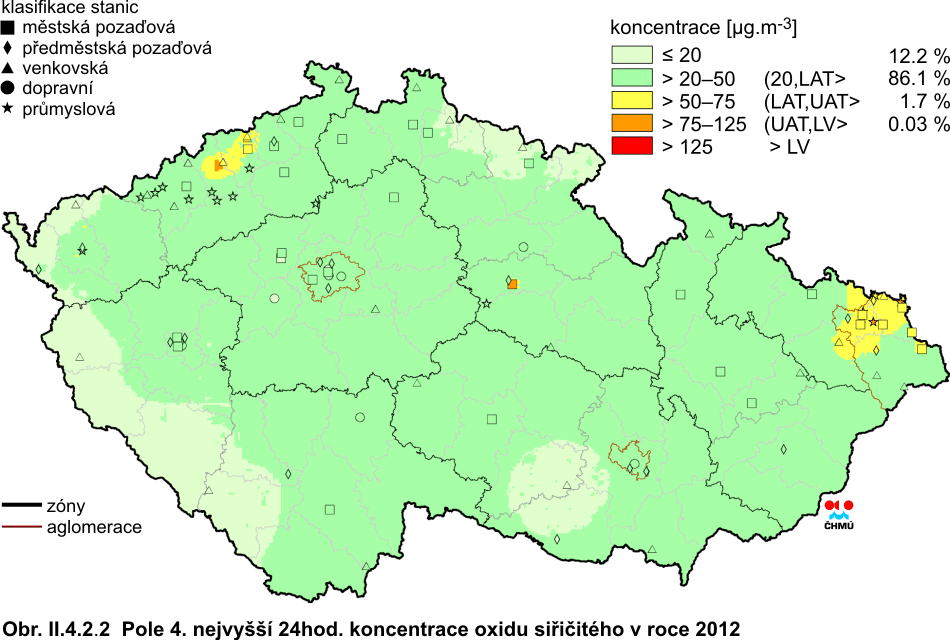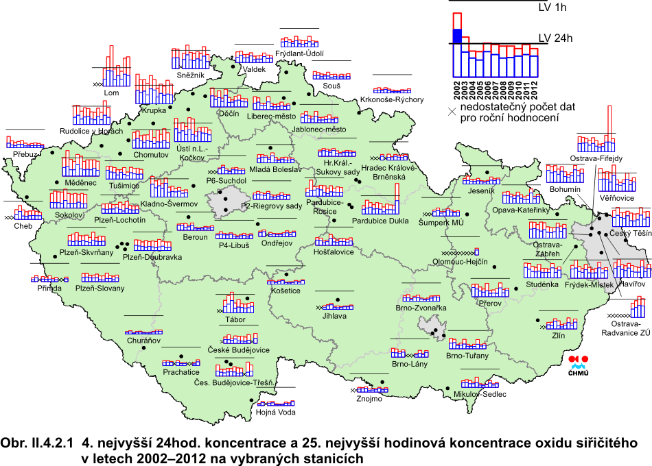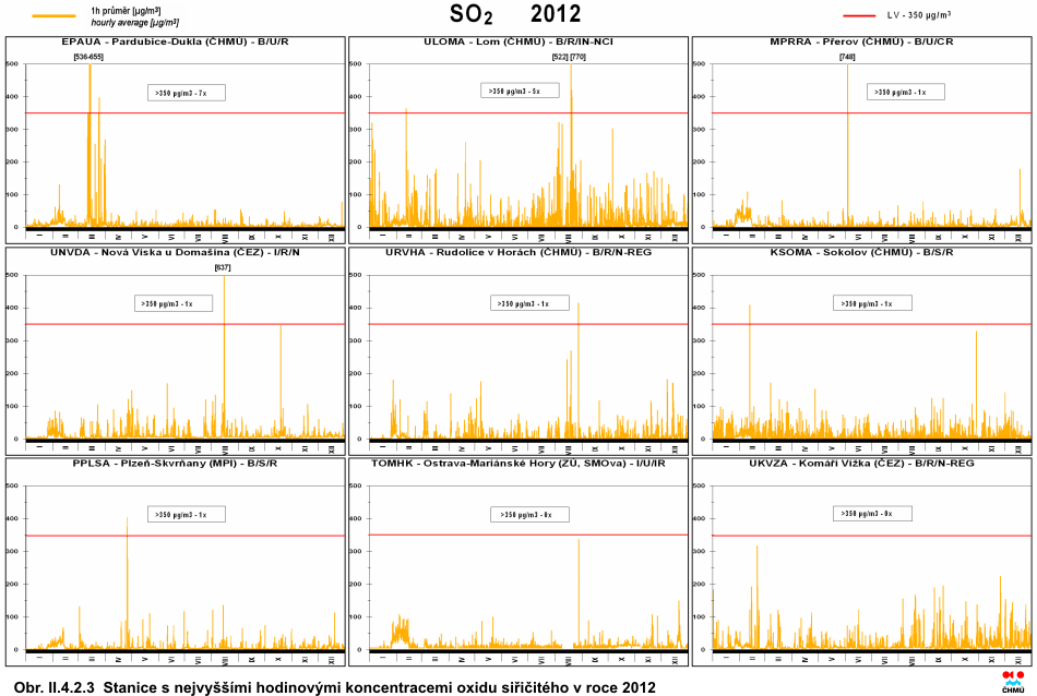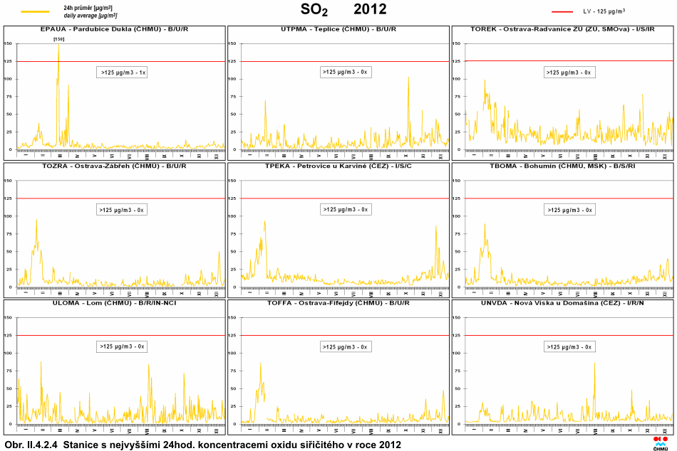 II.4.2 Česká republika II.4.2.1 Kvalita ovzduší vzhledem k imisním limitům pro ochranu zdraví II.4.2.1.1 Oxid siřičitý Hlavním antropogenním zdrojem oxidu siřičitého (SO2) je spalování fosilních paliv (uhlí a těžkých olejů) a tavení rud s obsahem síry. V atmosféře je SO2 oxidován na sírany a kyselinu sírovou vytvářející aerosol jak ve formě kapiček, tak i pevných částic širokého rozsahu velikostí. SO2 a látky z něj vznikající jsou z atmosféry odstraňovány mokrou a suchou depozicí. SO2 má dráždivé účinky, při vysokých koncentracích může způsobit zhoršení plicních funkcí a změnu plicní kapacity [22]. Situaci znečištění SO2 v roce 2012 ve vztahu k imisním limitům stanoveným legislativou dokumentují tab. II.4.2.1 a II.4.2.2 a obr. II.4.2.1–II.4.2.4. Pro názornost je zařazena i tabulka ročních průměrných koncentrací SO2 (tab. II.4.2.3). V roce 2012 nebyly v České republice překročeny imisní limity pro SO2 pro hodinovou ani pro 24hodinovou koncentraci na žádné měřicí stanici. K překročení hodnoty pro 24hodinový limit (125 μg.m-3) došlo v povoleném počtu (méně než nebo rovno třem) pouze na stanici Pardubice-Dukla. V případě hodinových koncentrací došlo k překročení hodnoty pro imisní limit (350 μg.m-3) v povoleném počtu (méně než nebo rovno 24), a to nejvíce na lokalitách v Pardubickém a Ústeckém kraji (Pardubice-Dukla 7krát, Lom 5krát). Méně než tři překročení byly zaznamenány na lokalitách v Plzni-město, Chomutově, Sokolově, Mostu a Přerově. Z obr. II.4.2.1 je patrný vývoj 4. nejvyšší 24hodinové a 25. nejvyšší hodinové koncentrace SO2 na vybraných lokalitách. V roce 2012 došlo v porovnání s rokem 2011 k nárůstu průměrných ročních koncentrací SO2 na 52 % lokalit. Oproti roku 2011 byl také zaznamenán nárůst 25. nejvyšší hodinové koncentrace (na 52 % lokalit), a 4. nejvyšší 24hodinové koncentrace (na 65 % lokalit). Vyšší koncentrace v roce 2012 byly dány zejména výskytem nepříznivých meteorologických a rozptylových podmínek v zimním období (především v lednu a únoru). Územní rozložení 4. nejvyšší 24hodinové koncentrace SO2 je patrné na