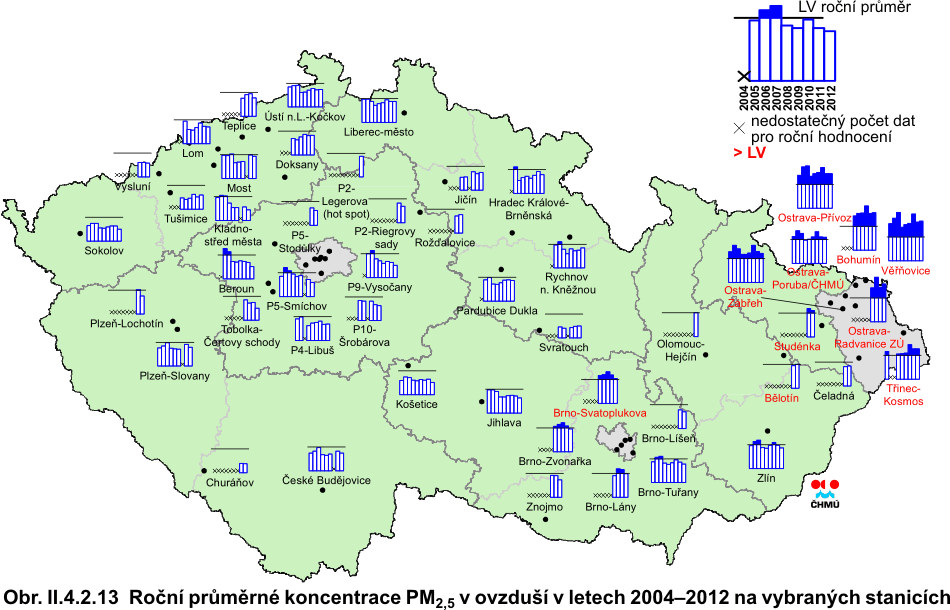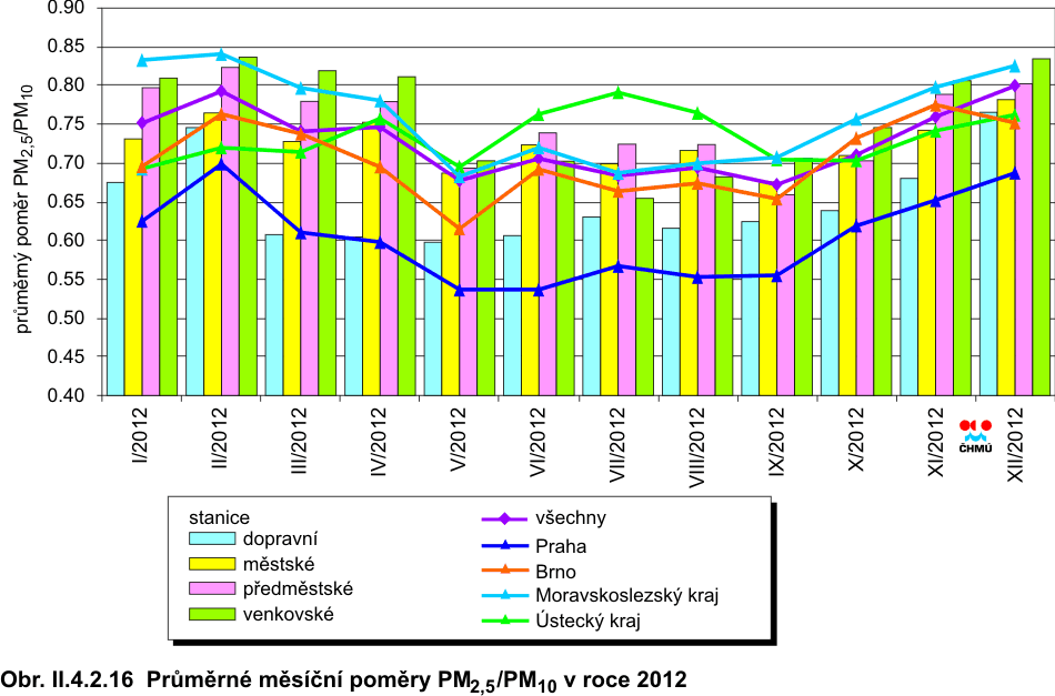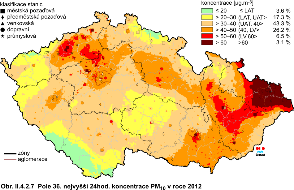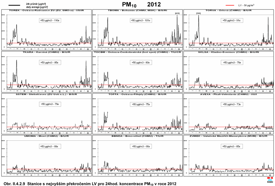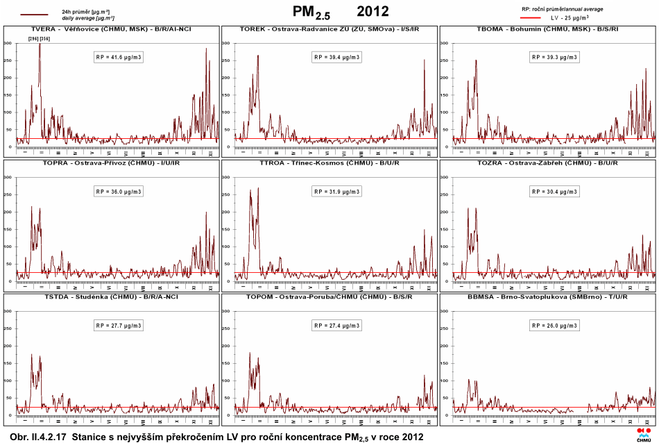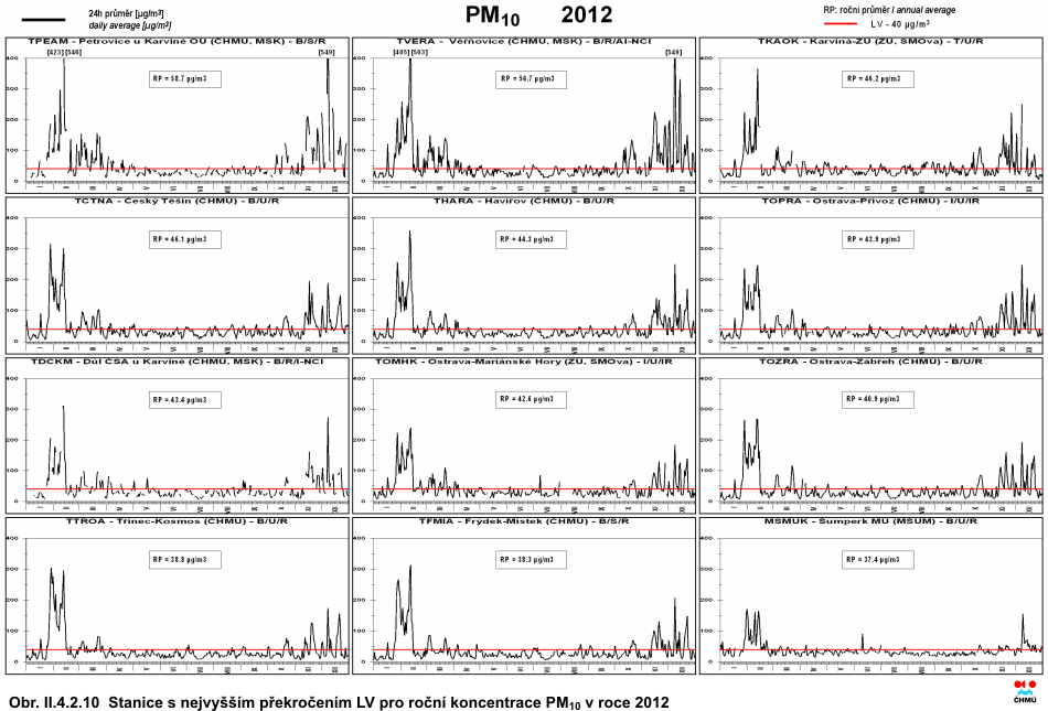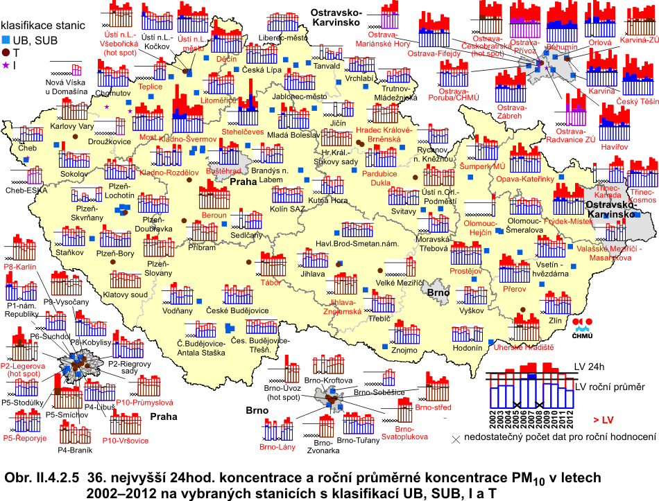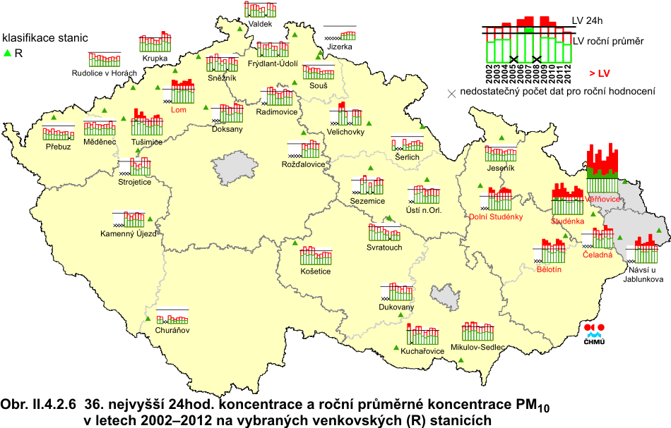Obr. II.4.2.5 36. nejvyšší 24hod. koncentrace a roční průměrné koncentrace PM10 v letech 2002–2012 na vybraných stanicích s klasifikací UB, SUB, I a T Obr. II.4.2.6 36. nejvyšší 24hod. koncentrace a roční průměrné koncentrace PM10 v letech 2002–2012 na vybraných venkovských (R) stanicích Obr. II.4.2.7 Pole 36. nejvyšší 24hod. koncentrace PM10 v roce 2012 Obr. II.4.2.8 Pole roční průměrné koncentrace PM10 v roce 2012 Obr. II.4.2.9 Stanice s nejvyšším překročením LV pro 24hod. koncentrace PM10 v roce 2012 Obr. II.4.2.10 Stanice s nejvyšším překročením LV pro roční koncentrace PM10 v roce 2012 Obr. II.4.2.11 Počty překročení hodnoty imisního limitu pro 24hod. koncentrace PM10 v roce 2012 Obr. II.4.2.12 Roční průměrné koncentrace PM10 v letech 2008–2012 na stanicích, kde byl překročen imisní limit Obr. II.4.2.13 Roční průměrné koncentrace PM2,5 v ovzduší v letech 2004–2012 na vybraných stanicích Obr. II.4.2.14 Pole roční průměrné koncentrace PM2,5 v roce 2012 Obr. II.4.2.15 Podíl lokalit, kde došlo k překročení imisního limitu pro průměrnou 24hod. a roční koncentraci PM10 a pro cílový imisní limit pro roční průměrnou koncentraci PM2,5, 2000–2012 Obr. II.4.2.16 Průměrné měsíční poměry PM2,5/PM10 v roce 2012 Obr. II.4.2.17 Stanice s nejvyšším překročením LV pro roční koncentrace PM2,5 v roce 2012