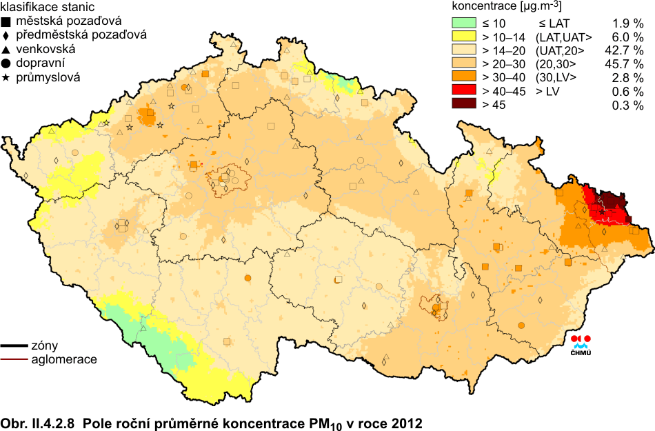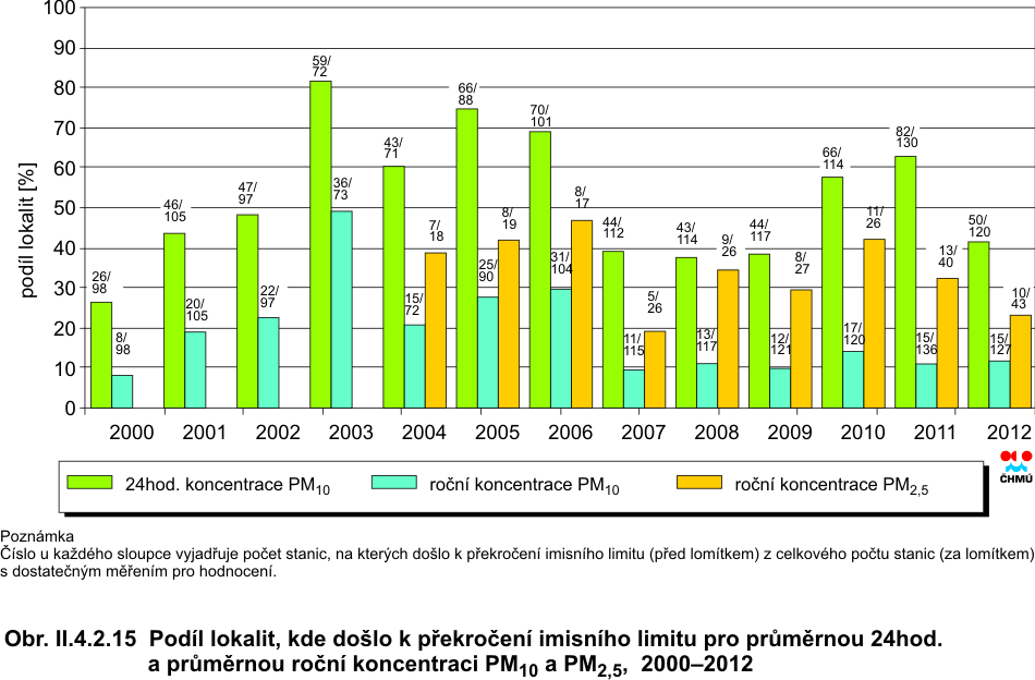 II.4.2.1.2 Suspendované částice frakce PM10 a PM2,5 Částice obsažené ve vzduchu lze rozdělit na primární a sekundární. Primární částice jsou emitovány přímo do atmosféry, ať již z přírodních (např. sopečná činnost, pyl nebo mořský aerosol) nebo z antropogenních zdrojů (např. spalování fosilních paliv ve stacionárních i mobilních zdrojích, otěry pneumatik, brzd a vozovek). Sekundární částice vznikají v atmosféře ze svých plynných prekurzorů SO2, NOx, NH3 a VOC procesem nazvaným konverze plyn-částice. Hlavními zdroji celkových emisí částic, tj. primárních částic a prekurzorů sekundárních částic je v České republice veřejná energetika (výroba elektrické a tepelné energie), doprava a sektor služeb, domácností (včetně vytápění domácností) a zemědělství. Z důvodu různorodosti emisních zdrojů mají suspendované částice různé chemické složení a různou velikost. Suspendované částice PM10 mají významné zdravotní důsledky, které se projevují již při velmi nízkých koncentrací bez zřejmé spodní hranice bezpečné koncentrace. Zdravotní rizika částic ovlivňuje jejich koncentrace, velikost, tvar a chemické složení. Při akutním působení částic může dojít k podráždění sliznic dýchací soustavy, zvýšené produkci hlenu apod. Tyto změny mohou způsobit snížení imunity a zvýšení náchylnosti k onemocnění dýchací soustavy. Opakující se onemocnění mohou vést ke vzniku chronické bronchitidy a kardiovaskulárním potížím. Při akutním působení částic může dojít k zvýraznění symptomů u astmatiků a navýšení celkové nemocnosti a úmrtnosti populace. Dlouhodobé vystavení působení částic může vést ke vzniku onemocnění respiračního a kardiovaskulárního systému. Míra zdravotních důsledků je ovlivněna řadou faktorů, jako je například aktuální zdravotní stav jedince, alergická dispozice nebo kouření. Citlivou skupinou jsou děti, starší lidé a lidé trpící onemocněním dýchací a oběhové soustavy [22]. V poslední době se ukazuje, že nejzávažnější zdravotní dopady, tj. kardiovaskulární a respirační účinky a navýšení úmrtnosti, mají jemné a ultrajemné částice [23]. Dle WHO dochází ve městech s vysokou mírou znečištění ovzduší k navýšení úmrtnosti o 15 až 20 % ve srovnání s úmrtností ve městech s relativně čistým ovzduším [24]. Znečištění ovzduší suspendovanými částicemi frakce PM10, zůstává jedním z hlavních problémů zajištění kvality ovzduší. Téměř na všech lokalitách České republiky je od roku 2001 do roku 2003 patrný vzestupný trend ve znečištění ovzduší PM10. Po zakolísání v roce 2004 byl v roce 2005 vzestupný trend obnoven téměř na všech lokalitách. V roce 2006 tento trend pokračoval na většině lokalit u ročních průměrů. V roce 2007 došlo naopak k poklesu koncentrací PM10. V roce 2008 klesající trend ve znečištění PM10 pokračoval na většině lokalit zejména v denních koncentracích. V roce 2009 převažoval mírný vzestup, více patrný v aglomeraci Moravskoslezský kraj. V roce 2010 došlo k nárůstu koncentrací PM10, a to v denních i ročních imisních charakteristikách. Vzestup koncentrací suspendovaných částic v roce 2010 byl dán zejména opakovaným výskytem nepříznivých meteorologických a rozptylovými podmínek v zimním období na začátku i ke konci roku. Nárůst koncentrací PM10 byl v roce 2010 pravděpodobně způsoben i nejchladnější topnou sezónou za posledních 10 let. V roce 2011 byl zaznamenán nepatrný pokles 36. nejvyšší koncentrace PM10 (v průměru pro všechny typy stanic). V roce 2012 byl opět naměřen meziroční pokles 36. nejvyšší koncentrace PM10, a to o více než 5 μg.m-3 (v průměru pro všechny typy stanic, na kterých byla 36. nejvyšší koncentrace PM10 měřena v letech 2011 i 2012). V roce 2012 byl zaznamenán i pokles průměrné roční koncentrace na většině měřicích stanic (obr. II.4.2.5 a II.4.2.6). V meziročním srovnání lze konstatovat i pokles maximálních průměrných denních koncentrací PM10 a zmenšení území, kde došlo k překročení denního imisního limitu. Na základě dat z lokalit, kde alespoň jednou došlo k překročení ročního imisního limitu za posledních 5 let (2008–2012), jasně vyplývá, že nejzatíženější oblastí je Ostravsko-Karvinsko, aglomerace (Praha a Brno) a Kladensko. Z dat dále vyplývá, že největší imisní zatížení PM10 bylo zaznamenáno v roce 2010, pokud hodnotíme posledních 5 let (obr. II.4.2.12, tab. II.4.2.6). Překročení denního imisního limitu pro PM10 bylo v roce 2012 alespoň na jedné lokalitě zaznamenáno ve všech zónách a aglomeracích (obr. II.4.2.11). V porovnání s rokem 2011 nejvyšší 36. průměrná 24hodinová koncentrace klesla na 81 % stanic (hodnotíme stejný soubor stanic s měřením v roce 2011 i 2012). Nejvíce zatíženou souvislou oblastí v roce 2012 byla, stejně jako v předešlých letech, aglomerace Ostrava/Frýdek-Místek/Karviná. Imisní limit 24hodinové koncentrace PM10 byl v roce 2012 překročen na všech lokalitách v aglomeraci Ostrava/Frýdek-Místek/Karviná, v zóně Moravskoslezsko. V zóně Střední Morava byl denní imisní limit překročen na třech čtvrtinách měřicích stanic, v aglomeraci Brno došlo k překročení na polovině stanic. Ve zbývajících oblastech bylo překročení zaznamenáno na cca 11 % stanic (zóna Jihovýchod, Jihozápad a Severovýchod), 22 % (zóna Střední Čechy), 28 % (zóna Severozápad) až 38 % stanic (aglomerace Praha). Z celkového počtu 120 lokalit s dostatečným počtem dat pro hodnocení došlo na 50 lokalitách (42 % stanic) k překročení 24hodinového imisního limitu PM10. Oproti roku 2011, kdy došlo k překročení denního imisn
