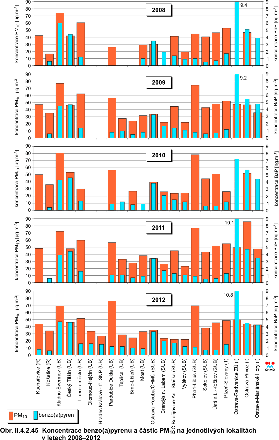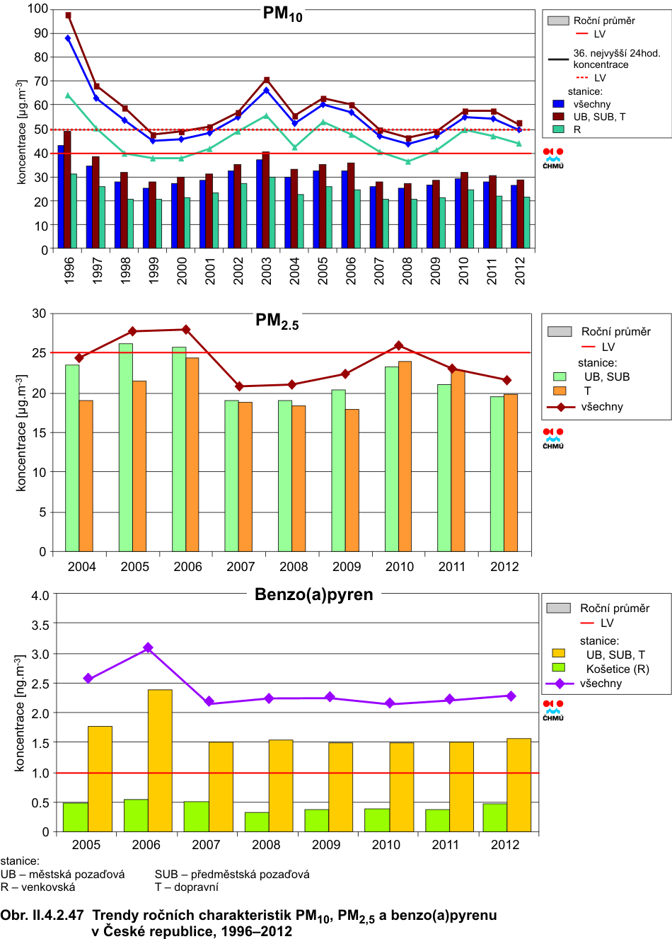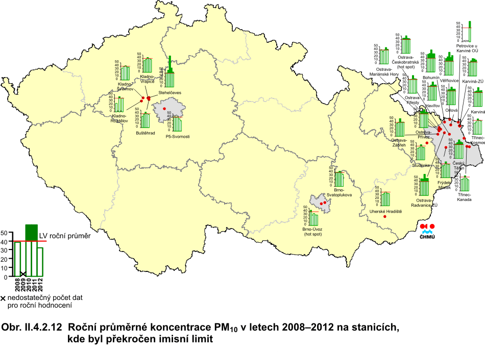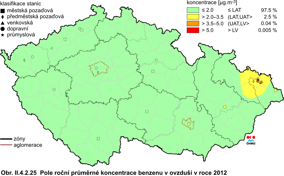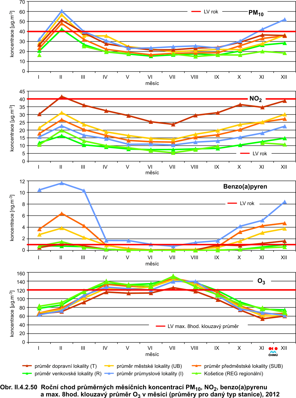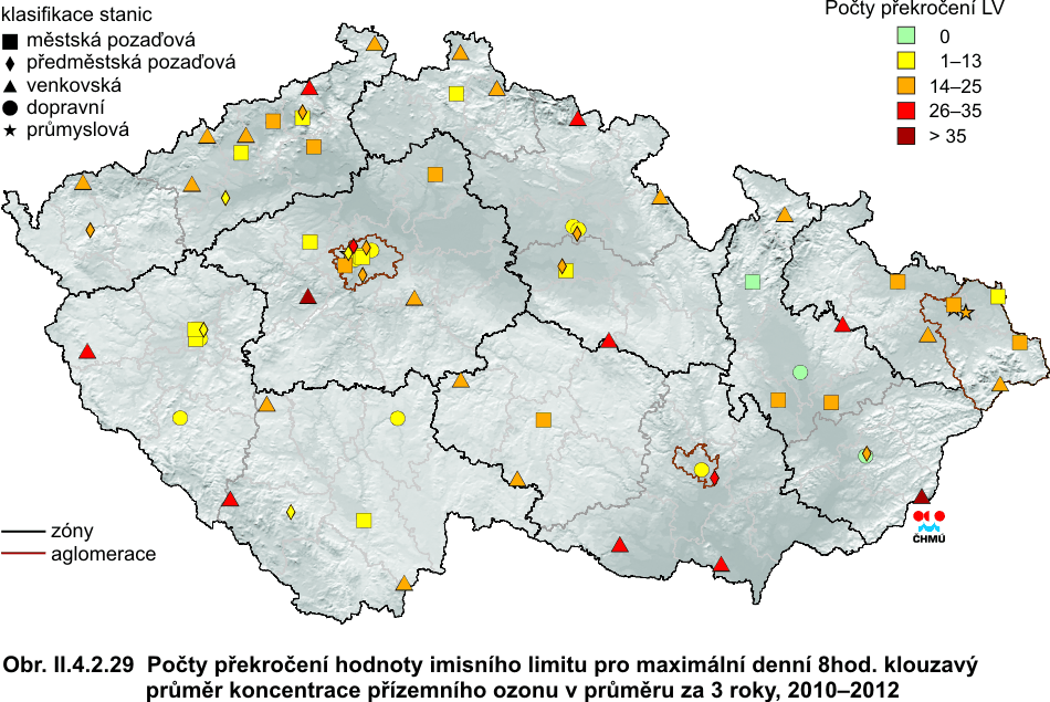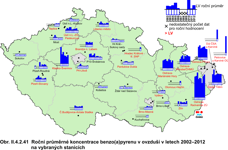 ve všech imisních charakteristikách. V roce 2011 došlo k poklesu hodnot téměř všech imisních charakteristik. Výjimkou je 36. nejvyšší koncentrace PM10, která meziročně nepatrně stoupla na městských stanicích. Při podrobnější analýze je jasné, že růst na městských stanicích byl způsoben nárůstem koncentrací na stanicích městských dopravních, a to o přibližně 8 % (4 μg.m-3) v porovnání s rokem 2011. Průměrná koncentrace na venkovských stanicích klesla pod hodnotu denního imisního limitu, koncentrace na ostatních typech lokalit zůstávají nadlimitní. Průměrná roční koncentrace PM10 poklesla na městských i venkovských stanicích. Podobně průměrné roční koncentrace PM2,5 poklesly, a to na všech typech stanicích, a dosáhly podlimitní úrovně. Koncentrace ostatních znečišťujících látek (SO2, NO2, NOx) poklesly, a to ve všech imisních charakteristikách a na všech typech lokalit. Největší meziroční pokles byl zaznamenán u 4. nejvyšší 24hodinové koncentrace SO2 a 19. nejvyšší hodinové koncentrace NO2. Pokles hodnot většiny imisních charakteristik pokračoval i v roce 2012. Výjimkou jsou koncentrace SO2, u kterého byl zaznamenán nárůst 4. nejvyšší 24hodinové koncentrace, a to o necelých 9 %. Nicméně hodnota 4. nejvyšší 24hodinové koncentrace SO2 stále leží hluboko pod imisním limitem. U ostatních imisních charakteristik a látek lze konstatovat stagnaci nebo pokles jejich trendu. Nepatrný pokles (2–3 %) byl zaznamenán u 19. nejvyšší hodinové koncentrace a roční koncentrace NO2. Průměrná roční koncentrace PM10, 36. nejvyšší koncentrace PM10 a průměrná roční koncentrace PM2,5 poklesla na všech typech stanic, přičemž patrnější je pokles na stanicích dopravních. 36. nejvyšší koncentrace PM10 v celorepublikovém průměru zůstává těsně pod hodnotou denního imisního limitu. Koncentrace ostatních znečišťujících látek (PM2,5, SO2, NO2, NOx) zůstávají pod hodnotou příslušného imisního limitu. Nicméně k překračování imisních limitů dochází nadále, zejména v hustě osídlených oblastech. Pravděpodobně dochází k jejich překračování i v místech, kde chybí monitoring látek znečišťujících ovzduší (malá sídla). Kolísání trendů jednotlivých znečišťujících látek je způsobeno jednak poklesem emisí, změnou skladby průmyslové výroby a používaných paliv, na druhou stranu velký vliv mají meteorologické a rozptylové podmínky. Úrovně benzo(a)pyrenu, na rozdíl od ostatních látek, jsou v celorepublikovém průměru dlouhodobě nadlimitní, a to více než dvojnásobně. Pro koncentrace benzo(a)pyrenu je stanoven imisní limit (1 ng.m-3). Trend koncentrací této znečišťující látky lze hodnotit od roku 2005. Nejvyšší koncentrace benzo(a)pyrenu byly naměřeny v roce 2006 (více než trojnásobné překročení hodnoty imisního limitu) v důsledku zhoršených meteorologických a rozptylových podmínek. Druhá nejvyšší koncentrace byla zaznamenána v roce 2009. Od roku 2007 koncentrace benzo(a)pyrenu kolísají; v roce 2012 v meziročním srovnání průměrná roční koncentrace opět mírně stoupla, a to o téměř 4 %. Jedná se tak o třetí nejvyšší hodnotu koncentrace za hodnocené období 2005–2012. Přízemní ozon je znečišťující látka odlišného charakteru než výše hodnocené polutanty. Jedná se o tzv. sekundární znečišťující látku dosahující nejvyšších koncentrací v teplém období roku. V období 1996–2006 nelze u koncentrací ozonu konstatovat jasný trend – imisní charakteristiky vykazují značné výkyvy. V roce 2003 je patrný vzestup koncentrací této látky z důvodu dlouhotrvajících velmi vysokých teplot a vysokých hodnot slunečního záření. V roce 2004 koncentrace mírně poklesly pod úroveň z let 1997–2002, v roce 2005 se koncentrace dostaly naopak mírně nad hodnoty z období 1997–2002. Naopak od roku 2006 imise ozonu klesaly kontinuálně až do roku 2009. V roce 2006 byl zaznamenán mírný nárůst koncentrací. V roce 2007 mírně poklesl průměr z 26. nejvyšších hodnot maximálních 8hodinových klouzavých průměrů. Naproti tomu však mírně stouply 76. nejvyšší hodnoty maximálních 8hodinových klouzavých průměrů za poslední 3 roky, a to především z toho důvodu, že rok 2007 byl v období duben–září teplejší (v průměru pro celou ČR o 1,2 °C) než rok 2004, který byl zahrnut do předchozího tříletého období a z hodnoceného období 2005–2007 již vypadl. V období 2006–2008 došlo k poklesu 76. nejvyšší hodnoty maximálních 8hodinových klouzavých průměrů, pravděpodobně díky poklesu koncentrace prekurzorů (NOx i VOC). Tento pokles je patrný z grafu trendů na všech typech lokalit, patrný je pokles koncentrací i pro samotný rok 2008. Pokles koncentrací ozonu následoval i v období 2007–2009, kdy na většině lokalit výrazně klesl počet překročení hodnoty imisního limitu 120 μg.m-3, a také, jak je z grafu patrné, v průměru poklesla i 26. nejvyšší hodnota maximálního 8hodinového klouzavého průměru pro samotný rok 2009, stejně jako v průměru za 3 roky. Z grafu trendů jsou také patrné vyšší koncentrace na venkovských lokalitách oproti koncentracím z městských a předměstských lokalit, kde je ozon odbouráván převážně emisemi z dopravy. V roce 2010 na venkovských stanicích mírně stoupla 26. nejvyšší hodnota maximálního 8hodinového klouzavého průměru, hodnoty 3letých průměrů koncentrací opět klesly. V roce 2011 se situace zopakovala – 26. nejvyšší hodnota maximálního 8hodinového klouzavého průměru pro všechny typy stanic opět stoupla; nárůst byl zapříčiněn vzrůstem koncentrací na venkovských stanicích. Pokračuje ale klesající trend 26. nejvyšší hod