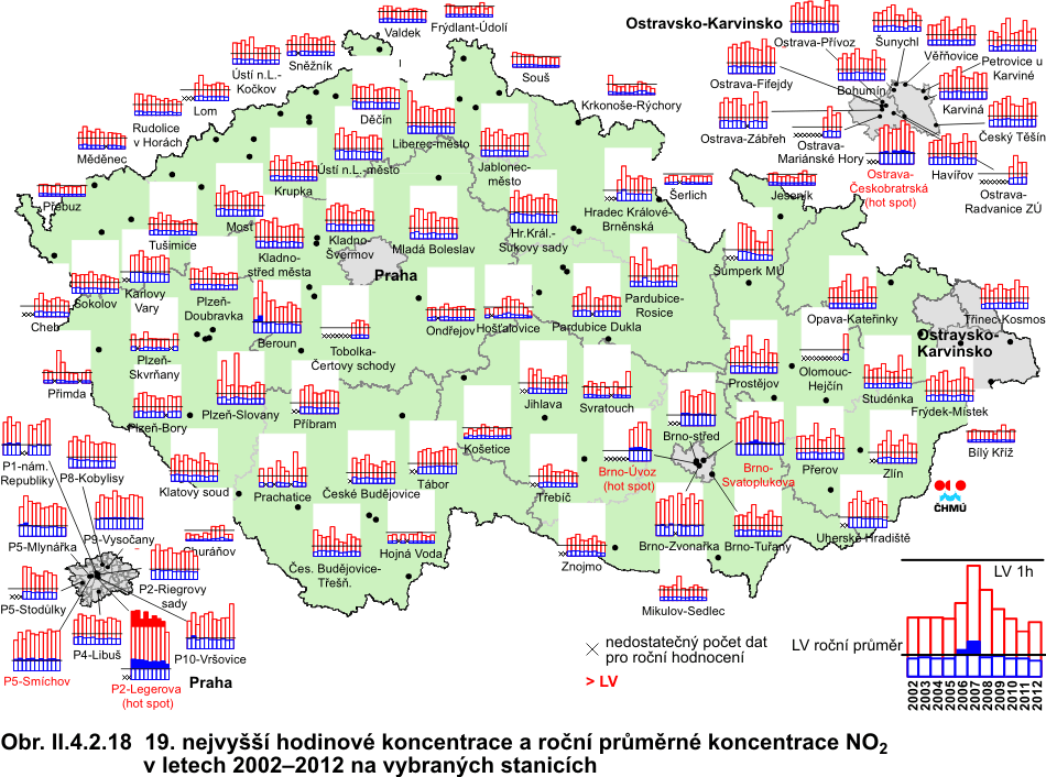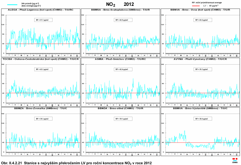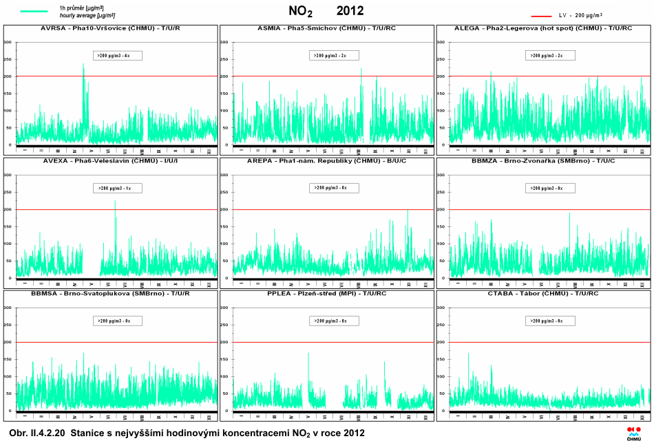 Při sledování a hodnocení kvality venkovního ovzduší se pod termínem oxidy dusíku (NOx) rozumí směs oxidu dusnatého (NO) a oxidu dusičitého (NO2). Imisní limit pro ochranu zdraví lidí je stanoven pro NO2, limit pro ochranu ekosystémů a vegetace je stanoven pro NOx. Více než 90 % z celkových oxidů dusíku ve venkovním ovzduší je emitováno ve formě NO. NO2 vzniká relativně rychle reakcí NO s přízemním ozonem nebo s radikály typu HO2, popř. RO2. Řadou chemických reakcí se část NOx přemění na HNO3/NO3-, které jsou z atmosféry odstraňovány suchou a mokrou atmosférickou depozicí. Pozornost je věnována NO2 z důvodu jeho negativního vlivu na lidské zdraví. Hraje také klíčovou roli při tvorbě fotochemických oxidantů. V Evropě vznikají emise NOx převážně z antropogenních spalovacích procesů, kde NO vzniká reakcí mezi dusíkem a kyslíkem ve spalovaném vzduchu a částečně i oxidací dusíku z paliva. Hlavní antropogenní zdroje představuje především silniční doprava (významný podíl má ovšem i doprava letecká a vodní) a dále spalovací procesy ve stacionárních zdrojích. Méně než 10 % celkových emisí NOx vzniká ze spalování přímo ve formě NO2. Přírodní emise NOx vznikají převážně z půdy, vulkanickou činností a při vzniku blesků. Jsou poměrně významné z globálního pohledu, z pohledu Evropy však představují méně než 10 % celkových emisí [27]. Expozice zvýšeným koncentracím NO2 ovlivňuje plicní funkce a způsobuje snížení imunity [28]. K překročení ročního imisního limitu NO2 dochází pouze na omezeném počtu stanic, a to na dopravně exponovaných lokalitách aglomerací a velkých měst. Z celkového počtu 112 lokalit, kde byl v roce 2012 monitorován oxid dusičitý, došlo na 5 stanicích k překročení ročního imisního limitu (tab. II.4.2.9). Všech pět stanic je klasifikováno jako dopravní městské. Lze předpokládat, že k překročení imisních limitů může docházet i na dalších dopravně exponovaných místech, kde není prováděno měření. Na žádné stanici nebylo v roce 2012 zaznamenáno překročení imisního limitu pro hodinovou koncentraci NO2. K překročení hodnoty tohoto imisního limitu (200 μg.m-3) došlo pouze na 3 stanicích v Praze, ale ani v jednom případě nedosáhl počet těchto překročení 18 dní v roce (Praha 10-Vršovice 4krát, Praha 5-Smíchov 2krát a Praha 2-Legerova hot spot 2krát). Na obr. II.4.2.18 je patrný vývoj 19. nejvyšší hodinové koncentrace a roční průměrné koncentrace NO2 v letech 2002–2012 na vybraných lokalitách. V roce 2002 byl oproti předchozím letům klesající trend koncentrací NO2 zastaven a v roce 2003 došlo na většině lokalit k mírnému zvýšení znečištění NO2. Po zakolísání v roce 2004 byl v roce 2005 vzestupný trend koncentrací NO2 obnoven a pokračoval v roce 2006. V roce 2007 došlo k výraznému poklesu koncentrací NO2 vlivem příznivějších meteorologických a rozptylových podmínek, stejně jako v roce 2008; v dalším roce došlo naopak k mírnému vzestupu koncentrací NO2 na většině stanic. V roce 2010 byl zaznamenán mírný nárůst roční průměrné koncentrace oproti roku 2009 na více než 70 % lokalit. V roce 2011 došlo v porovnání s rokem 2010 naopak k poklesu koncentrace NO2 na většině lokalit. Jak v případě 19. nejvyšší hodinové koncentrace, tak i v případě ročního průměru, došlo k poklesu koncentrace přibližně na 80 % lokalit. V roce 2012 tento klesající trend pokračoval. Průměrná roční koncentrace NO2 klesla na 71 % lokalit a 19. nejvyšší hodinová koncentrace na 62 % lokalit. Na mapě pole roční průměrné koncentrace NO2 (obr. II.4.2.19) je patrné znečištění měst, které je způsobeno převážně dopravou. Na obr. II.4.2.20 a II.4.2.21 jsou graficky znázorněny chody denních a hodinových koncentrací v roce 2012, kde je názorně vidět překročení imisního limitu na vybraných lokalitách. Při konstrukci mapy na obr. II.4.2.19 se přihlíželo i k aktuálním datům emisí z mobilních zdrojů v České republice. Vyšší koncentrace této látky mohou být i v blízkosti místních komunikací v obcích s intenzivní dopravou a hustou místní dopravní sítí. Tab. II.4.2.8 Stanice s nejvyššími hodnotami 19. a maximální hodinové koncentrace NO2 Tab. II.4.2.9 Stanice s nejvyššími hodnotami ročních průměrných koncentrací NO2 Obr. II.4.2.18 19. nejvyšší hodinové koncentrace a roční průměrné koncentrace NO2 v letech 2002–2012 na vybraných stanicích Obr. II.4.2.19 Pole roční průměrné koncentrace NO2 v roce 2012 Obr. II.4.2.20 Stanice s nejvyššími hodinovými koncentracemi NO2 v roce 2012 Obr. II.4.2.21 Stanice s nejvyšším překročením LV pro roční