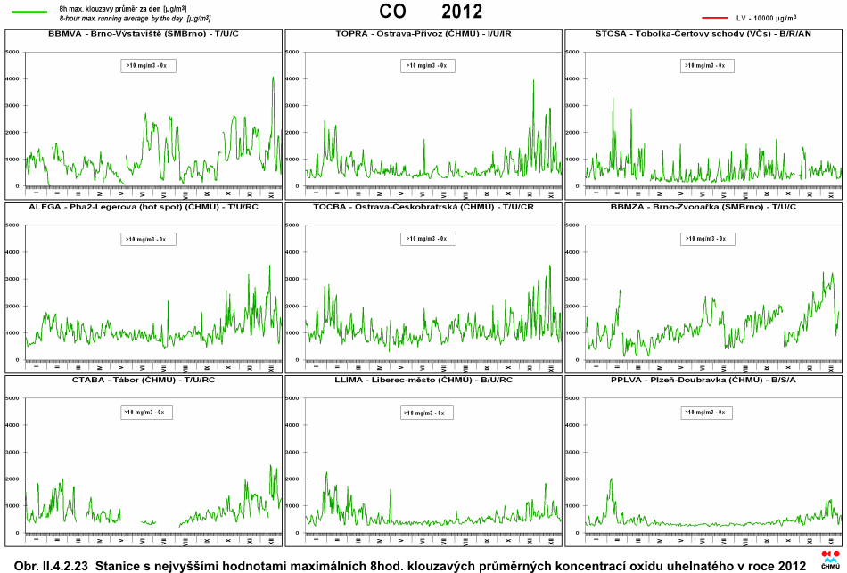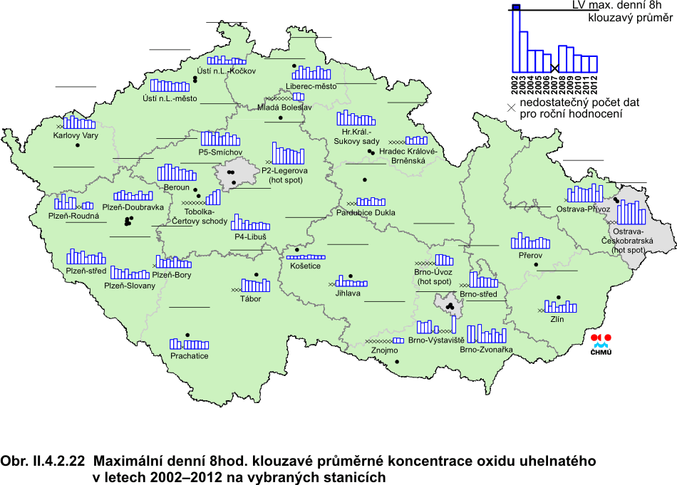 Obr. II.4.2.22 Maximální denní 8hod. klouzavé průměrné koncentrace oxidu uhelnatého v letech 2002–2012 na vybraných stanicích Obr. II.4.2.23 Stanice s nejvyššími hodnotami maximálních denních 8hod. klouzavých průměrných koncentrací oxidu uhelnatého v roce 2012