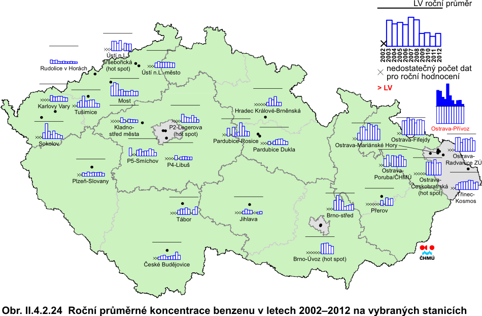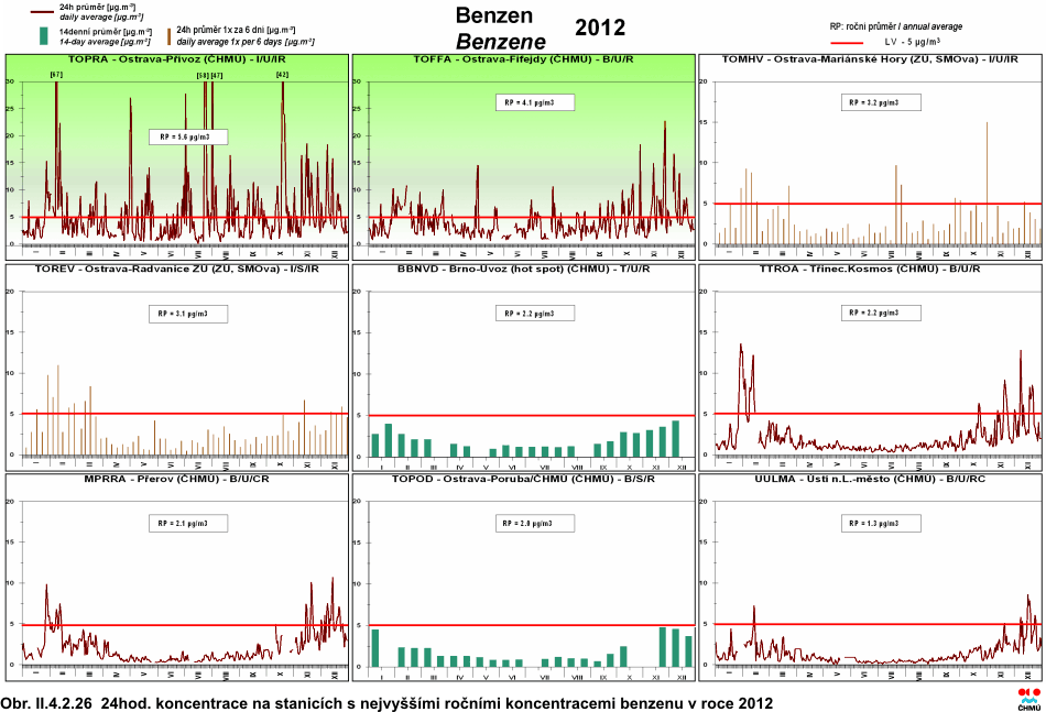 II.4.2.1.5 Benzen Antropogenní zdroje produkují více než 90 % celkových emisí do atmosféry. Hlavním emisním zdrojem jsou spalovací procesy, především mobilní zdroje, které představují cca 85 % celkových antropogenních emisí aromatických uhlovodíků, přičemž převládající část připadá na emise z výfukových plynů. Odhaduje se, že zbývajících 15 % emisí pochází ze stacionárních zdrojů. Rozhodující podíl připadá na procesy produkující aromatické uhlovodíky a procesy, kde se tyto sloučeniny používají k výrobě dalších chemikálií. Dalším významným zdrojem emisí jsou ztráty vypařováním při manipulaci, skladování a distribuci benzinů. Benzen obsažený ve výfukových plynech je především nespálený benzen z paliva. Dalším příspěvkem k emisím benzenu z výfukových plynů je benzen vzniklý z nebenzenových aromatických uhlovodíků, popř. z nearomatických uhlovodíků obsažených v palivu. Mezi nejvýznamnější škodlivé efekty expozice benzenu patří poškození krvetvorby a dále jeho karcinogenní účinky [29]. V roce 2012 byly koncentrace benzenu měřeny celkem na 23 lokalitách s platným ročním průměrem. Imisní limit je definován jako roční průměrná koncentrace 5 μg.m-3. Hodnota imisního limitu byla, podobně jako v předchozích letech, překročena na lokalitě Ostrava-Přívoz (5,6 μg.m-3). Vyšší koncentrace souvisejí v této oblasti s průmyslovou činností (především s výrobou koksu). Přibližně na třech čtvrtinách lokalit došlo v porovnání s rokem 2011 k poklesu roční průměrné koncentrace, na čtvrtině lokalit potom zůstaly tyto koncentrace obdobné. Chody ročních průměrných koncentrací jsou na vybraných lokalitách patrné na obr. II.4.2.24. Obr. II.4.2.26 prezentuje roční chod 24hodinových průměrů na vybraných lokalitách. Tab. II.4.2.11 Stanice s nejvyššími hodnotami ročních průměrných koncentrací benzenu.