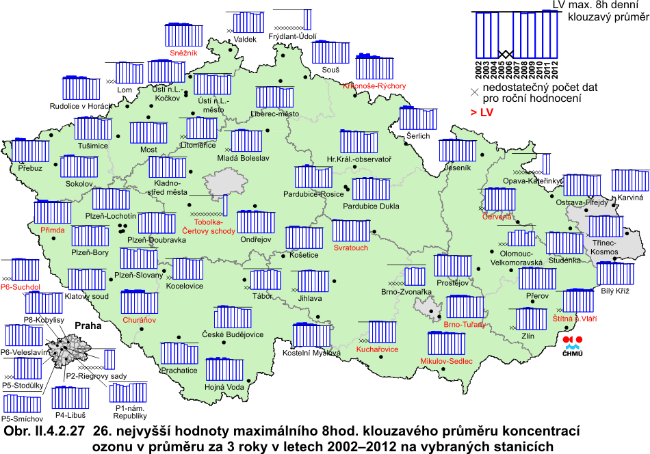 Obr. II.4.2.27 26. nejvyšší hodnoty maximálního denního 8hod. klouzavého průměru koncentrací přízemního ozonu v průměru za 3 roky v letech 2002–2012 na vybraných stanicích Obr. II.4.2.28 Pole 26. nejvyššího maximálního denního 8hod. klouzavého průměru koncentrace přízemního ozonu v průměru za 3 roky, 2010–2012 Obr. II.4.2.29 Počty překročení hodnoty cílového imisního limitu pro maximální denní 8hod. klouzavý průměr koncentrace přízemního ozonu v průměru za 3 roky, 2010–2012 Obr. II.4.2.30 Stanice s nejvyššími hodnotami maximálních denních 8hod. klouzavých průměrných koncentrací přízemního ozonu v období 2010–2012