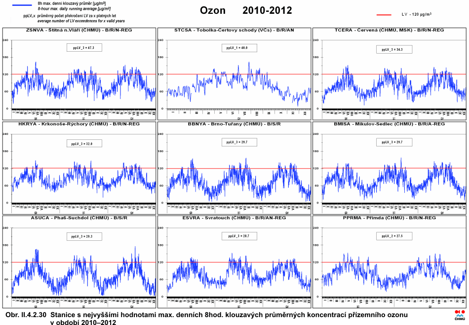 II.4.2.1.6 Přízemní ozon Přízemní ozon je sekundární znečišťující látkou v ovzduší, která nemá vlastní významný emisní zdroj. Vzniká za účinku slunečního záření komplikovanou soustavou fotochemických reakcí zejména mezi oxidy dusíku (NOx), těkavými organickými látkami (VOC) a dalšími složkami atmosféry. Ozon je velmi účinným oxidantem. Poškozuje převážně dýchací soustavu, způsobuje podráždění, morfologické, biochemické a funkční změny a snižuje obranyschopnost organismu. Je prokazatelně toxický i pro vegetaci. Zákon o ochraně ovzduší č. 201/2012 Sb., požaduje hodnocení koncentrace ozonu ve vztahu k ochraně lidského zdraví provádět jako průměr za poslední tři roky. Pokud nejsou tři roky k dispozici, je brán průměr za dva roky, popř. jeden rok. V roce 2012 byl ozon měřen na 67 lokalitách, z nichž na 12 (17,9 %) došlo k překročení imisního limitu za tříleté období 2010–2012, popř. kratší. V porovnání s předchozím tříletým obdobím 2009–2011 došlo k poklesu počtu překročení hodnoty imisního limitu 120 μg.m-3 na 30 % lokalitách, na 58 % došlo k nárůstu a na 12 % nebyl zaznamenán rozdíl. Situace se tedy oproti předchozímu tříletému období 2009–2011 do určité míry změnila, jak dokládá i obr. II.4.2.29. Ve srovnávání tříletých hodnocených období hrají roli především meteorologické podmínky, resp. hodnoty slunečního svitu, teploty a výskyt srážek v období od dubna do září, kdy jsou obvykle měřeny nejvyšší koncentrace ozonu. Porovnáme-li meteorologické podmínky roku 2009, který se již do tříletého hodnocení nezahrnoval, a roku 2012, byly v roce 2012 během období duben–září naměřeny mírně vyšší teploty (v průměru o 0,3 °C). Přibližně na 96 % lokalit, které sledují dané meteorologické parametry, došlo k nárůstu maximálních teplot a na 82 % lokalit došlo k nárůstu hodnot sum denních průměrů globálního slunečního záření. Dle [30] jsou při současné úrovni koncentrace prekurzorů přízemního ozonu meziroční rozdíly v koncentracích ozonu dány především výše uvedenými meteorologickými podmínkami a vliv koncentrací prekurzorů není tak významný. Srovnáme-li koncentrace prekurzorů přízemního ozonu v roce 2009 a 2012, došlo asi u dvou třetin látek řazených do skupiny VOC, detailně sledovaných v Košeticích a na Libuši, k mírnému nárůstu koncentrací. Roční koncentrace NO2 v porovnání s rokem 2009 naopak spíše mírně poklesly (na 55 % lokalit). Vzhledem ke značně komplikované atmosférické chemii vzniku a zániku ozonu, jeho závislosti na absolutním množství i relativním zastoupení jeho prekurzorů v ovzduší, související i s dálkovým přenosem, a dále i na meteorologických podmínkách, je obtížné meziroční změny blíže komentovat. Lokality s uvedeným počtem překročení hodnoty imisního limitu (120 μg.m-3) jsou uvedeny v tab. II.4.2.12. Nejméně zatížené jsou dopravní lokality ve městech, kde je ozon odbouráván chemickou reakcí s NO, jak je patrné i z obr. II.4.2.50. Lze předpokládat, že koncentrace ozonu se nacházejí pod imisním limitem i v dalších dopravně zatíženějších městech, kde však z důvodu absence měření nelze pomocí stávající metodiky konstrukce map toto pravděpodobné snížení dokumentovat. Naopak nejvyšší koncentrace jsou měřeny na venkovských pozaďových lokalitách z důvodu nižších koncentrací látek odbourávajících ozon (NO). Obr. II.4.2.27 znázorňuje 26. nejvyšší hodnotu maximálního 8hodinového klouzavého průměru koncentrací ozonu (v průměru za 3 roky) pro období 2002–2012. Tab. II.4.2.12 uvádí přehled stanic s nejvyššími hodnotami maximálních denních 8hodinových klouzavých průměrných koncentrací ozonu v průměru za 3 roky. Obr. II.4.2.29 graficky znázorňuje počty překročení hodnoty imisního limitu pro přízemní ozon a obr. II.4.2.30 prezentuje roční chody maximálních denních 8hodinových klouzavých průměrů na nejzatíženějších lokalitách. Tab. II.4.2.13 prezentuje počty hodin překročení zvláštního imisního limitu pro ozon 180 μg.m-3 za období měření 1995–2012 na vybraných stanicích AIM. Z obr. II.4.2.50, jež charakterizuje měsíční trendy ozonu (maximální 8hodinový klouzavý průměr za daný měsíc), je patrný nárůst koncentrací v jarních a letních měsících z důvodu příznivých podmínek pro vznik ozonu, jako je vysoká intenzita slunečního záření, vysoké teploty a nízká vlhkost vzduchu. Je zřejmé, že nejvyšší maximální 8hodinové klouzavé průměry jsou zaznamenávány na venkovských lokalitách, naopak nejnižší na lokalitách dopravních. V porovnání s předcházejícím rokem byly v roce 2012 zaznamenány poněkud vyšší hodnoty maximálních 8hodinových klouzavých průměrů přesahujících na většině typů lokalit hodnotu 140 μg.m-3.
