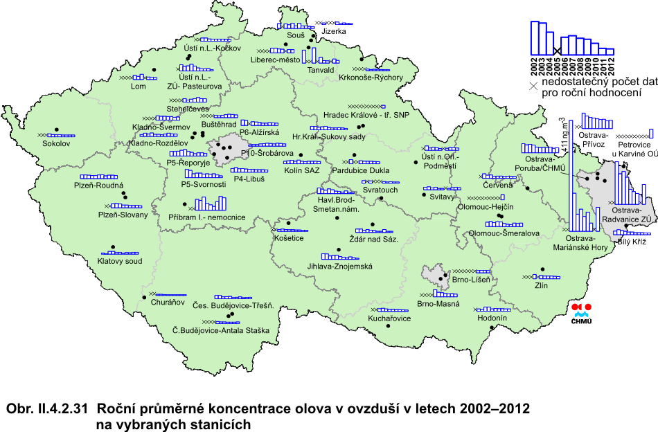 II.4.2.1.7 Těžké kovy Olovo Většina olova obsaženého v atmosféře pochází z antropogenních emisí, mezi které jsou řazeny vysokoteplotní procesy, především spalování fosilních paliv, výroba železa a oceli a metalurgie neželezných kovů. Z přirozených zdrojů je významné zvětrávání hornin a vulkanická činnost [31]. Olovo se v ovzduší vyskytuje ve formě jemných částic s četnostním rozdělením velikosti charakterizovaným středním aerodynamickým průměrem menším než 1 μm. Při dlouhodobé expozici lidského organismu se projevují účinky na biosyntézu hemu (nebílkovinná složka krevního hemoglobinu), nervový systém a krevní tlak. Expozice olovu představuje riziko i pro vyvíjecí se plod, může negativně ovlivnit vývoj mozku a následně ovlivnit duševní vývoj [32, 33]. Mezinárodní agentura pro výzkum rakoviny (IARC – International Agency for Research on Cancer) klasifikuje olovo z hlediska karcinogenity pro člověka do skupiny 2B (tzn. možné karcinogenní účinky) [34]. Na žádné z 51 lokalit, které dodaly dostatek údajů pro výpočet platného ročního průměru pro rok 2012, nedošlo k překročení imisního limitu (500 ng.m-3). Nejvyšší roční průměr byl zaznamenán na lokalitě Ostrava-Mariánské hory (88,5 ng.m-3). S výjimkou roku 2011, kdy bylo maximum koncentrace zaznamenáno na lokalitě Příbram I-nemocnice, jsou nejvyšší koncentrace olova opakovaně měřeny v oblasti Ostravsko-Karvinsko. Koncentrace olova na všech lokalitách leží hluboko pod imisním limitem a nedosahují ani hodnoty dolní meze pro posuzování 250 ng.m-3 (viz obr. II.4.2.31). Oproti roku 2011 došlo k poklesu koncentrací téměř na třech čtvrtinách lokalit (z celkového počtu 45 stanic, které měřily koncentrace olova v roce 2011 i 2012). Průběhy krátkodobých (24hodinových, případně 14denních koncentrací, podle režimu měření na uvedené stanici) průměrných koncentrací na vybraných lokalitách prezentuje obr. II.4.2.32. Nejvyšší koncentrace byly naměřeny na stanicích v Ostravě, v zóně Střední Čechy a na jedné stanici v Liberci (v tab. II.4.2.14). Tab. II.4.2.14 Stanice s nejvyššími hodnotami ročních průměrných koncentrací olova v ovzduší