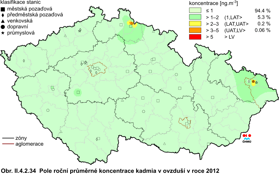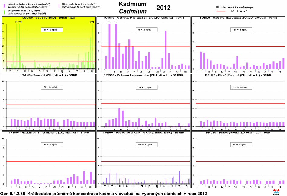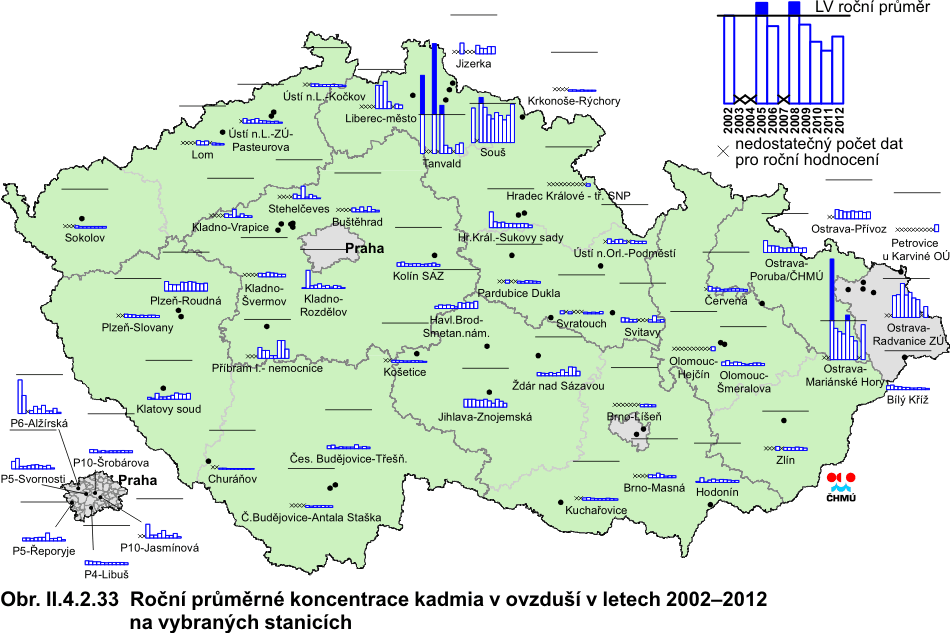Kadmium Antropogenní zdroje kadmia tvoří v globálním pohledu cca 90 % emisí do ovzduší. Převážně se jedná o výrobu železa, oceli, metalurgie neželezných kovů, spalování odpadů a fosilních paliv (hnědé uhlí, černé uhlí a těžké topné oleje) [35]. Méně významným zdrojem emisí je doprava. Zbylých 10 % tvoří přirozené zdroje (především vulkanická činnost). Kadmium je navázáno převážně na částice jemné frakce (s aerodynamickým průměrem do 2,5 μm), která je spojena s větším rizikem negativního vlivu na lidské zdraví. Téměř veškeré kadmium je vázáno na částice do velikosti 10 μm. V částicích s aerodynamickým průměrem nad 10 μm najdeme minimální množství kadmia. Dlouhodobá expozice kadmia ovlivňuje funkci ledvin. Může také negativně ovlivnit dýchací soustavu; mezi důsledky vlivu kadmia patří i rakovina plic [28]. Kadmium je prokazatelně karcinogenní pro zvířata i pro člověka [34]. Roční imisní limit (5 ng.m-3) nebyl v roce 2012 překročen na žádné z 51 lokalit, kde byl naměřen platný roční průměr. Stejně jako v předchozích dvou letech byl nejvyšší roční průměr naměřen na lokalitě Souš (4,9 ng.m-3). V porovnání s rokem 2011 došlo na více než na 70 % lokalit (z celkového počtu 45 stanic, které měřily koncentrace olova v roce 2011 i 2012) k poklesu průměrné roční koncentrace. Vývoj ročních průměrných koncentrací během let 2002–2012 je patrný z obr. II.4.2.33. Průběhy krátkodobých (24hodinových, případně 14denních koncentrací, podle režimu