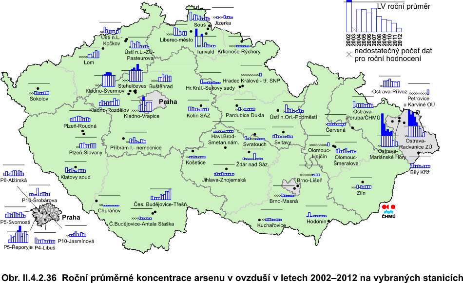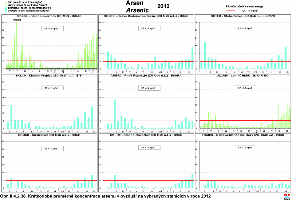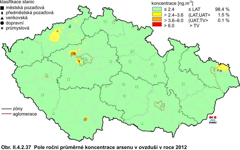 Arsen se vyskytuje v mnoha formách anorganických i organických sloučenin. Antropogenní činnost produkuje asi tři čtvrtiny celkových emisí do ovzduší. Významné jsou hlavně spalovací procesy (hnědé uhlí, černé uhlí a těžké topné oleje), výroba železa a oceli a výroba mědi a zinku. Mezi hlavní přírodní zdroje patří v prvé řadě vulkanická činnost, dále pak požáry lesů, zvětrávání minerálů a činnost mikroorganismů (v mokřinách, močálech a příbřežních oblastech). Arsen se vyskytuje převážně v částicích jemné frakce (s aerodynamickým průměrem do 2,5 μm), která může být transportována na delší vzdálenost a pronikat hlouběji do dýchací soustavy. Téměř veškerý arsen je vázán na částice s aerodynamickým průměrem do velikosti 10 μm [35]. Dle IARC [34] je arsen klasifikován jako prokázaný lidský karcinogen. Anorganický arsen může vyvolat akutní, subakutní nebo chronické účinky, které mohou být lokální nebo zasáhnout organismus celkově. Kritickým účinkem vdechování arsenu je rakovina plic [29, 35]. Z celkového počtu 51 lokalit, které dodaly dostatek údajů pro výpočet platného ročního průměru pro rok 2012, nebyl imisní limit překročen na žádné z nich. K splnění imisního limitu pro arsen, tedy k nepřekročení hodnoty roční průměrné koncentrace 6 ng.m-3 na žádné měřicí stanici, došlo v roce 2012 poprvé od roku 1986, kdy bylo měření arsenu v SPM potažmo PM10, zahájeno. Oproti předchozímu roku 2011 došlo přibližně na více než polovině lokalit k