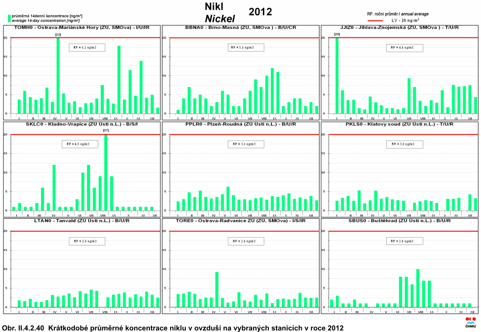 Nikl Jedná se o pátý nejhojnější prvek zemského jádra, i když v zemské kůře je jeho zastoupení nižší. Mezi hlavní antropogenní zdroje, které v globálu tvoří přes 60 % celkových emisí, lze řadit výrobu kovů, těžbu niklových rud a rafinaci niklu, spalování odpadu a fosilních paliv. Mezi hlavní přírodní zdroje lze řadit kontinentální prach a vulkanickou činnost [35]. Nikl se vyskytuje v atmosférickém aerosolu v několika chemických sloučeninách, které se liší svou toxicitou pro lidské zdraví i ekosystémy. Asi 70 % částic obsahujících nikl tvoří frakci menší než 10 μm, tyto částice mohou být proto transportovány na delší vzdálenosti. Asi ze 30 % se nikl vyskytuje v aerosolu s aerodynamickým průměrem větším nebo rovným 10 μm, který rychle sedimentuje v blízkosti zdroje [35]. Ze zdravotního hlediska způsobuje nikl alergické kožní reakce, může ovlivnit dýchací soustavu a obranyschopnost člověka [28, 32]. Sloučeniny niklu jsou klasifikovány dle IARC jako prokázaný lidský karcinogen, kovový nikl a jeho slitiny jsou klasifikovány jako možný karcinogen [34]. Z celkového počtu 51 lokalit, které dodaly dostatek údajů pro výpočet platného ročního průměru pro rok 2012, nebyl imisní limit překročen na žádné z nich. Nejvyšší hodnota koncentrace 6,2 ng.m-3 byla změřena na stanici Ostrava-Mariánské hory. Mírný pokles roční průměrné koncentrace oproti předchozímu roku byl zaznamenán na více než polovině lokalit. Stanice s nejvyššími hodnotami ročních průměrných koncentrací jsou uvedeny v tab. II.4.2.17. Roční chod krátkodobých (14denních) koncentrací niklu je patrný z obr. II.4.2.40. Tab. II.4.2.17 Stanice s nejvyššími hodnotami ročních průměrných koncentrací niklu v ovzduší