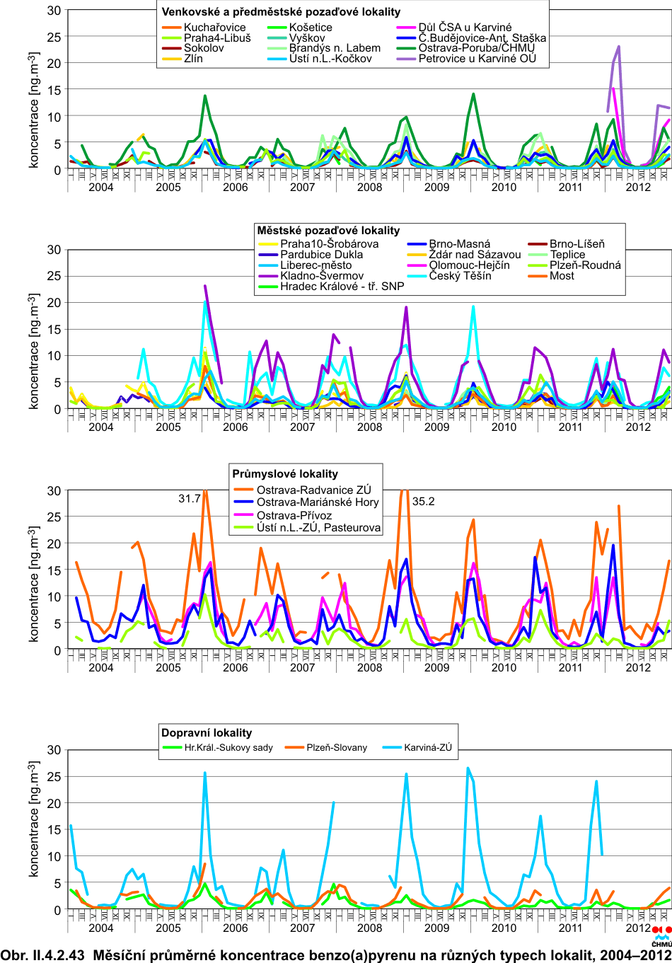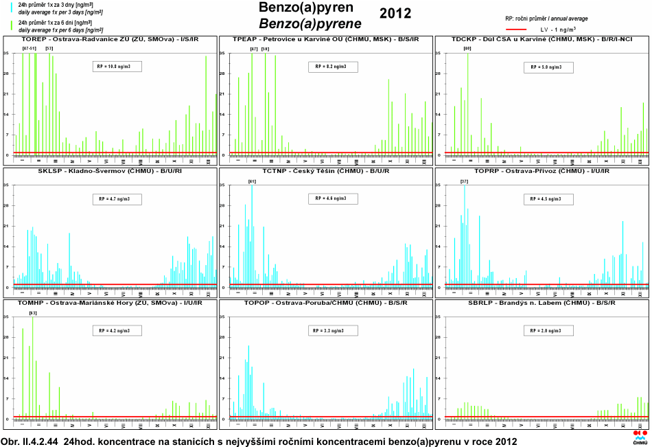 4.2.1.8 Benzo(a)pyren Příčinou vnosu benzo(a)pyrenu do ovzduší, stejně jako ostatních polycyklických aromatických uhlovodíků (PAH), jejichž je benzo(a)pyren hlavním představitelem, je jednak nedokonalé spalování fosilních paliv jak ve stacionárních, tak i mobilních zdrojích, ale také některé technologie jako výroba koksu a železa. Ze stacionárních zdrojů jsou to především domácí topeniště (spalování uhlí a dřeva), která produkují více než 60 % z celkových emisí benzo(a)pyrenu, a spalování odpadu. Z mobilních zdrojů jsou to zejména vznětové motory spalující naftu. Mobilní zdroje jsou druhým nejvýznamnějším zdrojem emisí benzo(a)pyrenu (více než 20 %) v České republice [32, 36]. Mezi přírodní zdroje benzo(a)pyrenu patří lesní požáry a sopečné erupce, které mohou přispět k lokálním hladinám pozadí benzo(a)pyrenu [37]. Přibližně 80–100 % PAH s pěti a více aromatickými jádry (tedy i benzo(a)pyren) je navázáno především na částice menší než 2,5 μm, tedy na tzv. jemnou frakci atmosférického aerosolu PM2,5 (sorpce na povrchu částic). Tyto částice přetrvávají v atmosféře poměrně dlouhou dobu (dny až týdny), což umožňuje jejich transport na velké vzdálenosti (stovky až tisíce km). U benzo(a)pyrenu, stejně jako u některých dalších PAH, jsou prokázány karcinogenní účinky na lidský organismus [34, 37]. V roce 2012 překročily roční průměrné koncentrace benzo(a)pyrenu imisní limit na 20 z celkového počtu 29 stanic s dostatečným počtem měření pro hodnocení. V meziročním srovnání nedošlo k významné změně, neboť v roce 2011 došlo k překročení na 23 lokalitách z 30 (s dostatečným počtem naměřených dat pro hodnocení). Průměrná koncentrace (zprůměrováno pro všechny typy stanic, které měřily v roce 2011 i 2012) v roce 2012 byla 2,20 ng.m-3; v roce 2011 se jednalo o hodnotu 2,12 ng.m-3. Nejvyšší roční průměrná koncentrace v roce 2012 byla, podobně jako v předešlých letech, naměřena na průmyslové lokalitě Ostrava-Radvanice ZÚ (10,8 ng.m-3), kde byla hodnota imisního limitu překročena téměř jedenáctinásobně. Vysokých nadlimitních koncentrací je však dosahováno i na lokalitách dopravních, ale i na pozaďových městských a předměstských. Řada měst a obcí byla vyhodnocena, stejně jako v předchozích letech, jako území s překročeným imisním limitem (obr. II.4.2.42). V roce 2012 byl imisní limit překročen na 26,5 % plochy území ČR (v roce 2011 na 16,8 % plochy území ČR). Procento obyvatel, které bylo v roce 2012 vystaveno nadlimitní koncentraci benzo(a)pyrenu, je odhadováno na 66,26 % (v roce 2011 přibližně 60,2 %). Je třeba mít na zřeteli, že odhad polí ročních průměrných koncentrací benzo(a)pyrenu (obr. II.4.2.42) je zatížen, ve srovnání s ostatními mapovanými látkami, největšími nejistotami plynoucími z nedostatečné hustoty měření. Na nejistotě mapy se podílí i absence měření na venkovských regionálních stanicích. Nejistotu do map však vnáší i absence měření v malých sídlech ČR, která by z hlediska znečištění ovzduší benzo(a)pyrenem reprezentovala zásadní vliv lokálních topenišť. Průměrné roční koncentrace v porovnání s rokem 2011 mírně vzrostly na 61 % lokalit. Vývoj průměrných ročních koncentrací na jednotlivých lokalitách během let 2002–2012 je patrný z obr. II.4.2.41. Koncentrace benzo(a)pyrenu vykazují výrazný roční chod s maximy v zimním období (v důsledku sezonních zdrojů, horších rozptylových podmínek a jednodušší konverze plyn-částice) a minimy v letním období (v důsledku konce topné sezony a chemického a fotochemického rozkladu benzo(a)pyrenu). Nárůsty koncentrací během zimního období (obr. II.4.2.43, obr. II.4.2.44 a obr. II.4.2.50) poukazují na vliv lokálních topenišť. V roce 2012 se jednalo zejména o období leden–březen a říjen–prosinec. Maximální koncentrace v únoru korespondují se špatnými rozptylovými podmínkami v tomto měsíci. Únor byl zároveň nejchladnějším měsícem roku 2012 (podrobněji viz kapitola II.5), což mohlo přispět i k vyšší intenzitě vytápění domácností. Roční chody krátkodobých koncentrací (24hodinových jednou za 3 popř. 6 dní) benzo(a)pyrenu na lokalitách s nejvyššími ročními průměry jsou patrné z obr. II.4.2.44. Fluktuace měsíčních průměrů koncentrací pro jednotlivé typy stanic během let 2004–2012 jsou patrné z obr. II.4.2.43. Na obr. II.4.2.45 jsou znázorněny pro jednotlivé lokality pro roky 2008–2012 koncentrace benzo(a)pyrenu ve vztahu ke koncentracím částic PM10, na jejichž především jemnou frakci (PM2,5) je benzo(a)pyren navázán. Obr. II.4.2.41 Roční průměrné koncentrace benzo(a)pyrenu v ovzduší v letech 2002–2012 na vybraných stanicích Obr. II.4.2.42 Pole roční průměrné koncentrace benzo(a)pyrenu v ovzduší v roce 2012 Obr. II.4.2.43 Měsíční průměrné koncentrace benzo(a)pyrenu na různých typech lokalit, 2004–2012 Obr. II.4.2.44 24hod. koncentrace na stanicích s nejvyššími ročními koncentracemi benzo(a)pyrenu v roce 2012 Obr. II.4.2.45 Koncentrace benzo(a)pyrenu a částic PM10 na jednotlivých lokalitách v letech 2008–2012