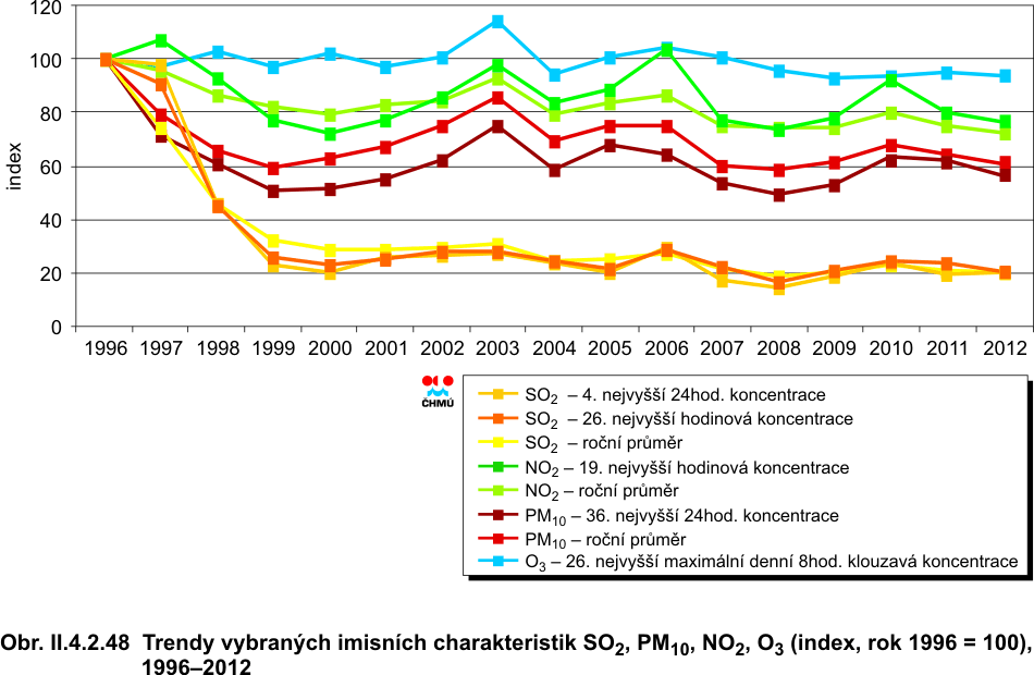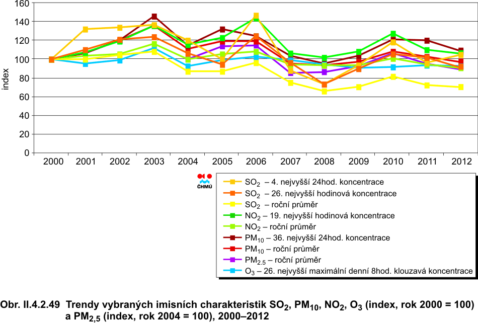 Trendy ročních imisních charakteristik SO2, PM10, NO2, NOx a O3 v České republice za období 1996–2012, dále benzo(a)pyrenu a PM2,5 za období 2004–2011 jsou uvedeny na obr. II.4.2.46 a II.4.2.47. Výsledné koncentrace znečišťujících látek v České republice i v aglomeracích, vztažené k jednotlivým rokům, představují průměrné hodnoty ze stanic, které měřily po celé sledované období. V průběhu 90. let je v celé ČR patrný klesající trend ve znečištění ovzduší SO2, PM10, NO2 a NOx, a to zejména v důsledku výrazného poklesu emisí znečišťujících látek. V letech 1996–2000 došlo k výraznému poklesu koncentrací SO2 (o cca 70–80 % v závislosti na imisní charakteristice) a PM10 (o cca 50–60 %) – obr. II.4.2.481. Vývoj trendů koncentrací jednotlivých znečišťujících látek je ovlivněn poklesem emisí, změnou skladby průmyslové výroby a dopravního parku a používaných paliv, na druhou stranu velký vliv mají meteorologické a rozptylové podmínky. Od roku 2001 byl původní klesající trend zastaven a naopak v porovnání s rokem 2000 dochází ke stagnaci až k navýšení koncentrací látek znečišťujících ovzduší (obr. II.4.2.49). Pokles emisí po roce 2000 nebyl již tak strmý jako v 90. letech 20. století (obr. I.1.1) a lze předpokládat, že kvalita ovzduší je nyní ovlivňována zejména meteorologickými a rozptylovými podmínkami během roku. V letech 2001–2003 koncentrace SO2, PM10, NO2 a NOx stoupají a v roce 2003 dosahují svých maximálních úrovní, pokud hodnotíme vývoj posledních 10 let. Vysoké koncentrace znečišťujících látek v roce 2003 byly důsledkem jak nepříznivých rozptylových podmínek v únoru a prosinci, tak i podnormálního množství srážek. V roce 2004 byl tento vzestupný trend ve znečištění PM10, NO2 a NOx zastaven a došlo naopak k určitému poklesu koncentrací těchto látek téměř na úroveň roku 2001. V roce 2005 byl obnoven vzestupný trend ve znečištění ovzduší PM10 a NO2, v případě PM10 šlo o strmější vzestup přesahující úroveň roku 2002, zvýšení koncentrací je patrné i u PM2,5. Tento vzestupný trend byl v roce 2006 potvrzen u NO2 a ročních koncentrací PM10 (na stanicích ve městech), přičemž výraznější vzestup byl zaznamenán v případě hodinových koncentrací NO2, a to téměř na úroveň roku 1997. 24hodinové koncentrace PM10 naopak mírně poklesly. V ročních průměrech koncentrací PM2,5 byla zaznamenána stagnace. Od roku 2003 do roku 2005 je patrný mírný pokles koncentrací SO2. Vzestup některých imisních charakteristik v letech 2005 a 2006 byl dán zejména zhoršenými rozptylovými podmínkami. V roce 2007 byl dosavadní kolísavý trend v úrovni koncentrací uvedených látek zastaven a došlo k výraznému snížení znečištění ovzduší SO2, PM10 (ve městech i na venkově), PM2,5, NO2 i NOx ve všech sledovaných imisních charakteristikách. Nejstrmější pokles je patrný, po předchozím vzestupu, u hodinových koncentrací NO2. Pokles koncentrací znečišťujících látek byl v roce 2007 dán příznivějšími meteorologickými a rozptylovými podmínkami, zejména v lednu a únoru. V roce 2008 pokračoval klesající trend ve znečištění ovzduší SO2 a PM10, v případě PM2,5 se projevila spíše stagnace. Pokud se týká NO2, v této látce se projevil mírný pokles v denních koncentracích, u NOx mírný pokles v ročních průměrech na venkovských stanicích. V roce 2009 byl naopak patrný vzestup znečištění ovzduší SO2, PM10, NO2 a NOx zhruba na úroveň roku 2007 ve všech uvedených znečišťujících látkách (kromě PM2,5). Vzestup koncentrací uvedených znečišťujících látek v ovzduší byl dán méně příznivými meteorologickými a rozptylovými podmínkami zejména v lednu, únoru a v prosinci 2009 oproti roku 2008. V roce 2010 růst koncentrací pokračoval, a to u všech látek