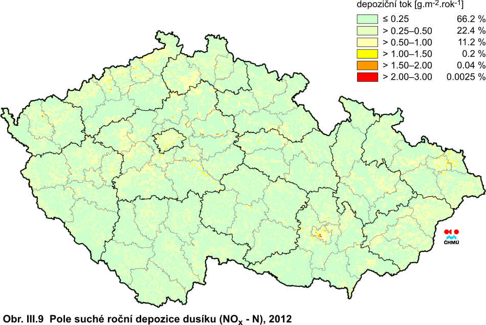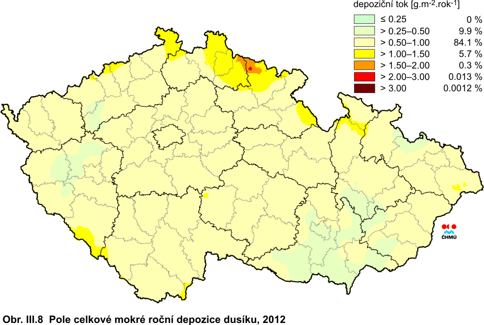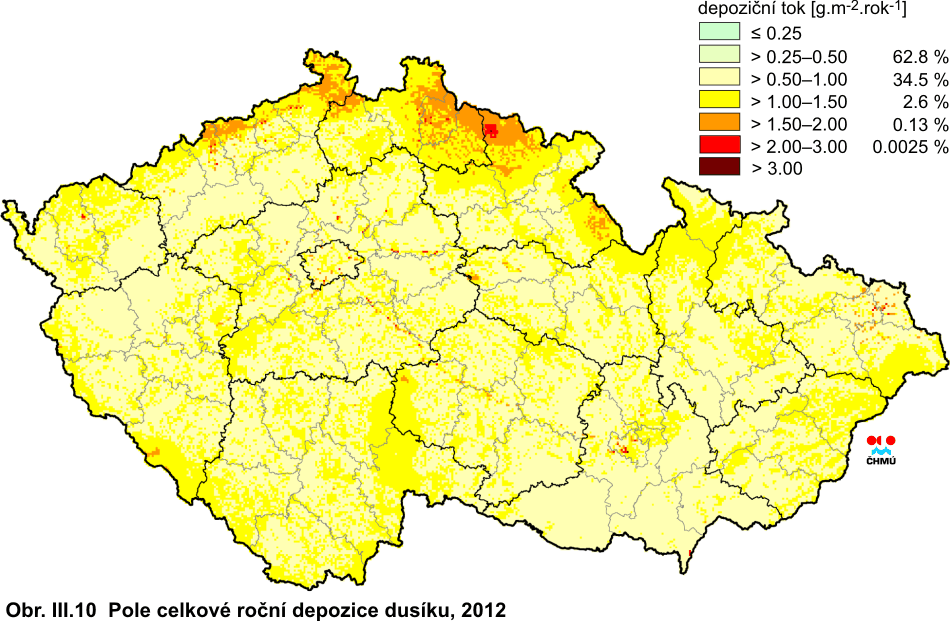 V roce 2012 byla celková depozice dusíku rovna hodnotě 75 133 t N (ox+red).