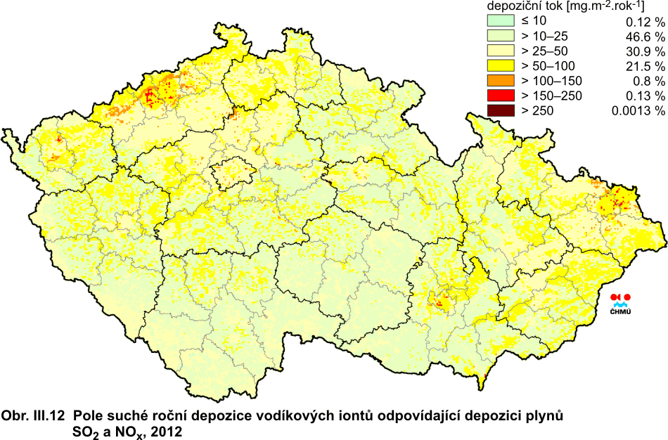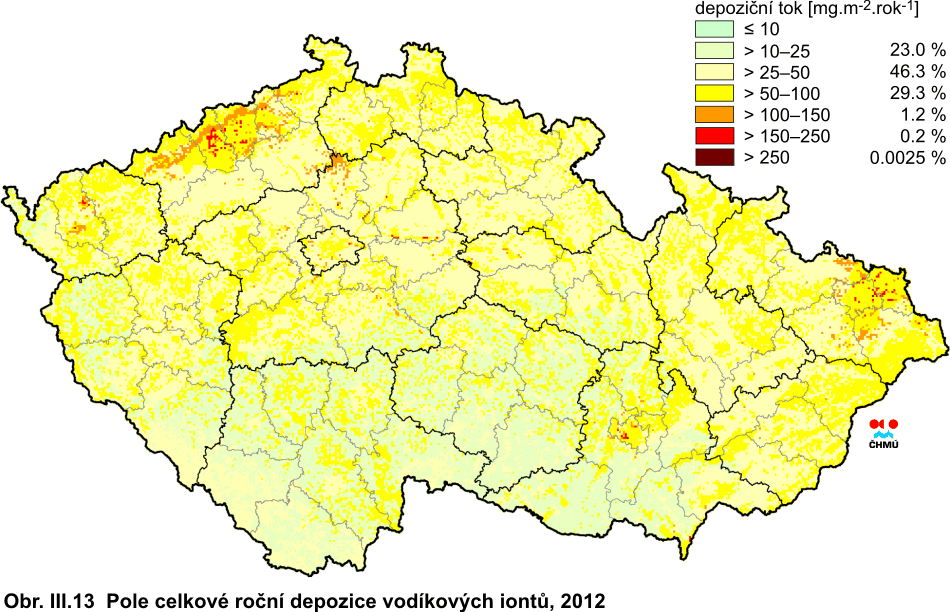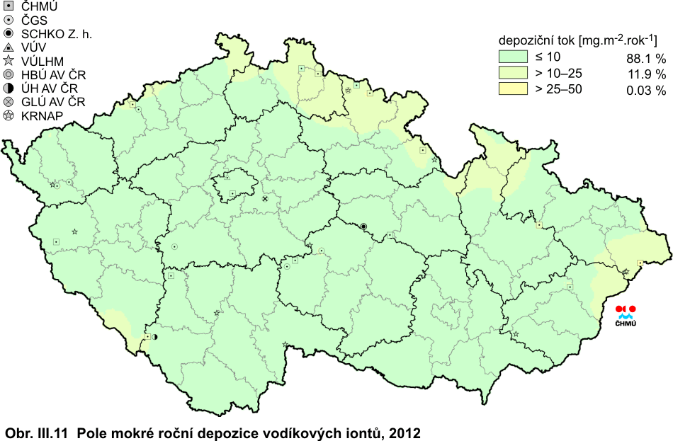 roce 2012 byla hodnota mokré depozice na území ČR v porovnání s rokem 2011