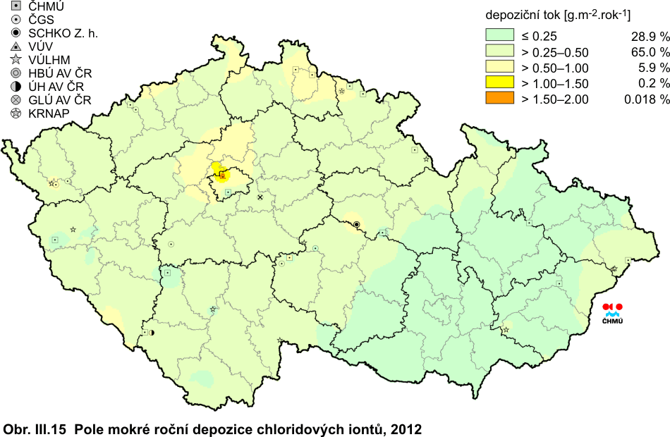 Nejvyšší hodnoty mokré depozice chloridových iontů byly