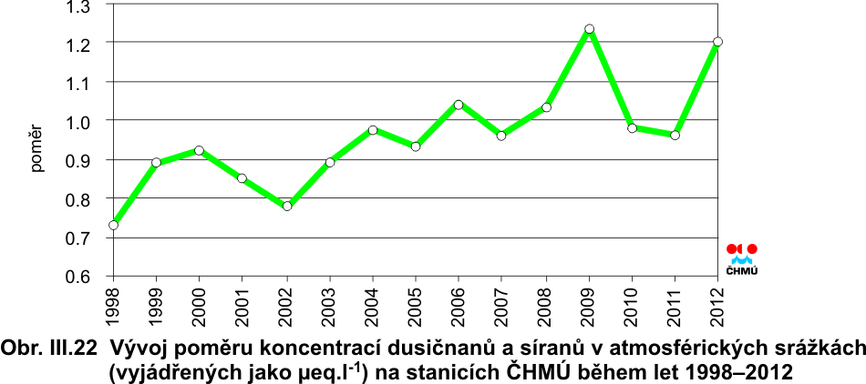 Obr. III.22 Vývoj poměru koncentrací dusičnanů a síranů v atmosférických