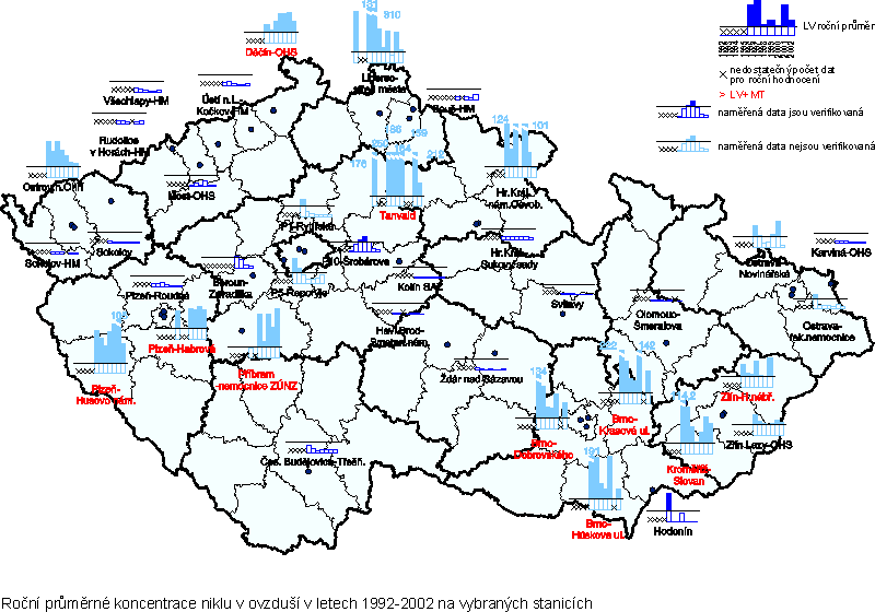 Nickel Nickel is the fifth most abundant element of the earth core, though in the earth crust its percentage share is lower. Similarly as in other heavy metals, the sources of nickel are the burning of fossil fuels (heavy fuel oils) and the production of iron. Of the total number of 72 stations from which data for 2002 were obtained, the set limit value incl. the margin of tolerance was exceeded at 10 Public Health Service stations. Further 10 stations reported the limit value exceedences (Table 2.2.16 and Fig. 2.2.27). At none of these Public Health Service stations however, the possibility of sample contamination was not ruled out. On the contrary, at those stations from which the data were declared as verified, no exceedences of the limit value occurred. Similarly as in other heavy metals and carbon monoxide, it is necessary to