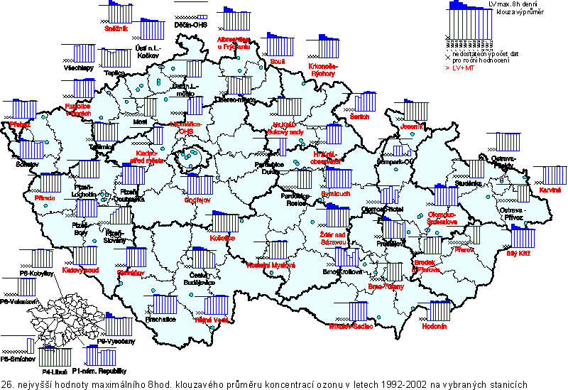 If the number of stations where the limit, or the limit incl. the margin of tolerance, was exceeded, is lower than 10, 10 stations with the highest values of the respective air pollution characteristics are presented. Further, maps depicting the development of the respective characteristics in the period 1992–2002 are presented. The 2002 exceedence of the limit value increased by the margin of tolerance is marked with red names of the stations. If in 2002 any characteristic of the respective pollutant was exceeded, also maps depicting the spatial distribution of the characteristic are presented. These maps show also the stations classified according to their type and marked with colour symbols in correspondence with the classes of the levels measured at the presented stations. For the stations and air pollution characteristics, where the number of