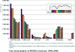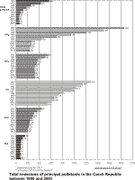 Pursuant to the legislation which came into force in 2002 air pollution sources are divided into several categories to carry out emission inventories. Complying with this categorisation, the ISKO system operated by CHMI includes REZZO 1–4 databases (Register of Emissions and Air Pollution Sources) which serve for archiving and presenting data on stationary and mobile air pollution sources. Extra large, large and medium-sized air pollution sources are monitored individually as point sources, small sources at local level as area sources and mobile sources as line sources (road transport in sections controlled by vehicle census) and as area sources at district level (other mobile sources). I. Extra large and large pollution sources - REZZO 1 The data used in the 2003 emission inventory of air pollutants from extra large and large sources (c. 3500 sources) was extracted from the summary operational inventory submitted by source operators to the Czech Environmental Inspection Office (ČIŽP) which is in charge of data collection and verification. Based on these data the REZZO 1 database has also been updated, i.e. constant and variable data on operation of air pollution sources (categorisation of sources, parameters, fuel consumption and emission quantity). The medium-sized sources category includes data on about 30,000 sources. Emission inventory data for 2003 is in charge of the authorities of the basic administrative units with extended competences. They will be available after the deadline of this Yearbook and, consequently, all emission data for the year 2003 in the tables are preliminary. Emissions from small sources (local heating units) have been inventoried based on the 1991 and 2001 General Census. Emission inventory is based on the model using updated data on climatic conditions, figures on heat consumption in household heating and consumption of particular fuel types calculated from them. Fuel composition is based on General Census information on the prevailing way of heating and on the used types of energy, updated annually according to data submitted by fuels and energy central suppliers. Inventories of emissions from transport, falling within the competency of the Ministry of Transport, have been processed by the Transport Research Centre (CDV) Brno based on the method of determination of transport emissions. Emissions from agricultural and forest machines and other vehicles were calculated with the use of the data on sale and consumption of fuels for the year 2003. Table 1.1 documents total emissions of principal