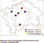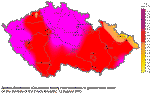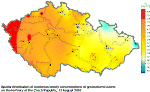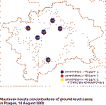 occurred simultaneously in western Europe, mainly in France and Germany. Fig. 2.3.1 Course of maximum daily temperatures, their long-term average and daily total precipitation at Prague-Libuš station. Occurrence of ozone concentrations exceeding 180 μg.m-3 on the territory of the Czech Republic. 1. 4. 2003–30. 9. 2003 Fig. 2.3.2 Maximum hourly concentrations of ground-level ozone on the territory of the Czech Republic, 12 August 2003 Fig. 2.3.3 Spatial distribution of maximum hourly concentrations of ground-level ozone on the territory of the Czech Republic, 12 August 2003 Fig. 2.3.4 Maximum hourly concentrations of ground-level ozone in Prague, 12 August 2003 Fig. 2.3.5 Maximum hourly concentrations of ground-level ozone on the territory of the Czech Republic, 13 August 2003 Fig. 2.3.6 Spatial distribution of maximum hourly concentrations of ground-level ozone on the territory of the Czech Republic, 13 August 2003 Fig. 2.3.7 Maximum hourly concentrations of ground-level ozone in Prague, 13 August 2003 Fig. 2.3.8 Maximum hourly concentrations of ground-level ozone on the territory of the Czech Republic, 14 August 2003 Fig. 2.3.9 Spatial distribution of maximum hourly concentrations of ground-level ozone on the territory of the Czech Republic, 14 August 2003 Fig. 2.3.10 Maximum hourly concentrations of ground-level ozone in Prague, 14 August 2003 Fig. 2.3.11 Analysis of air temperatures at the level of 850 hPa, 10–15 August 2003